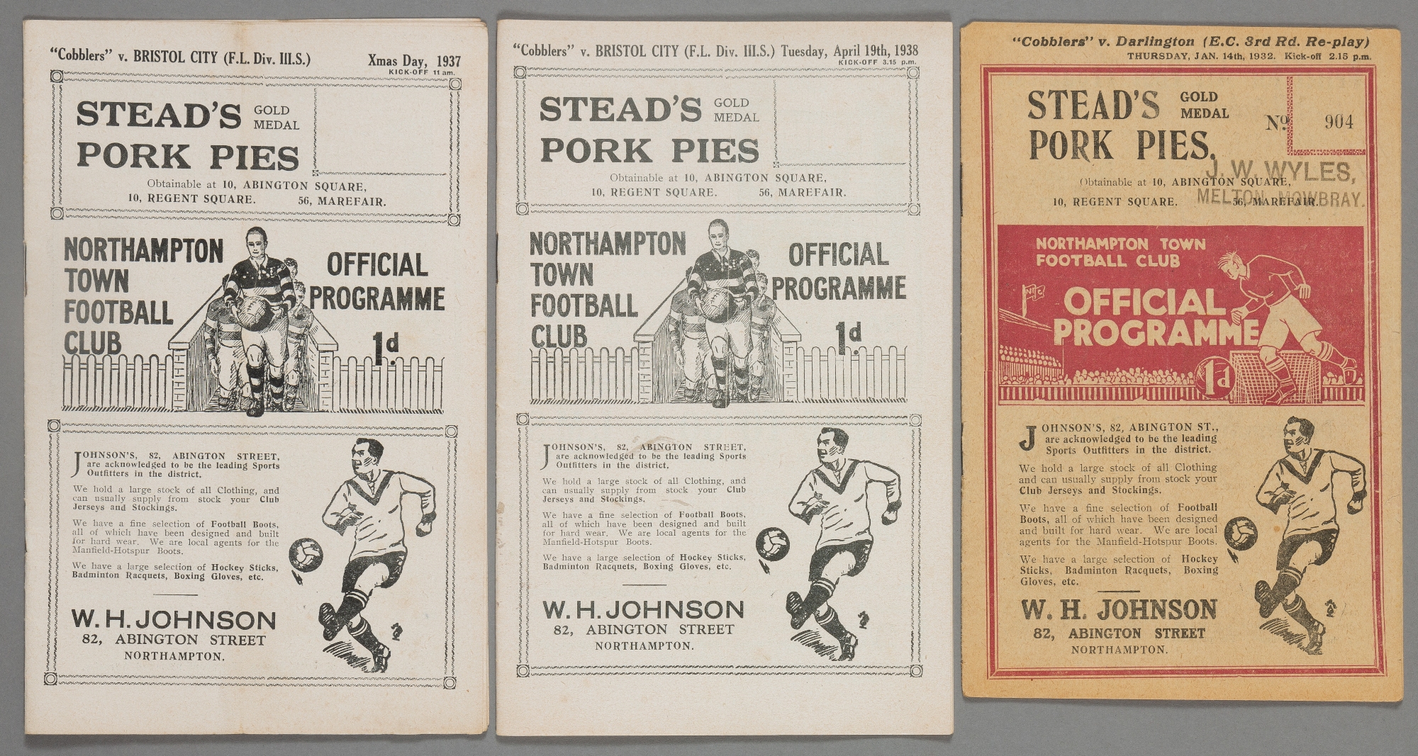 Three Northampton Town home programmes, the postponed programme v Bristol City 25th December 1937 and the re-arranged fixture programme 19th April 1938, F.L. Division Three (South); and a FAC3 replay v Darlington 14th January 1932