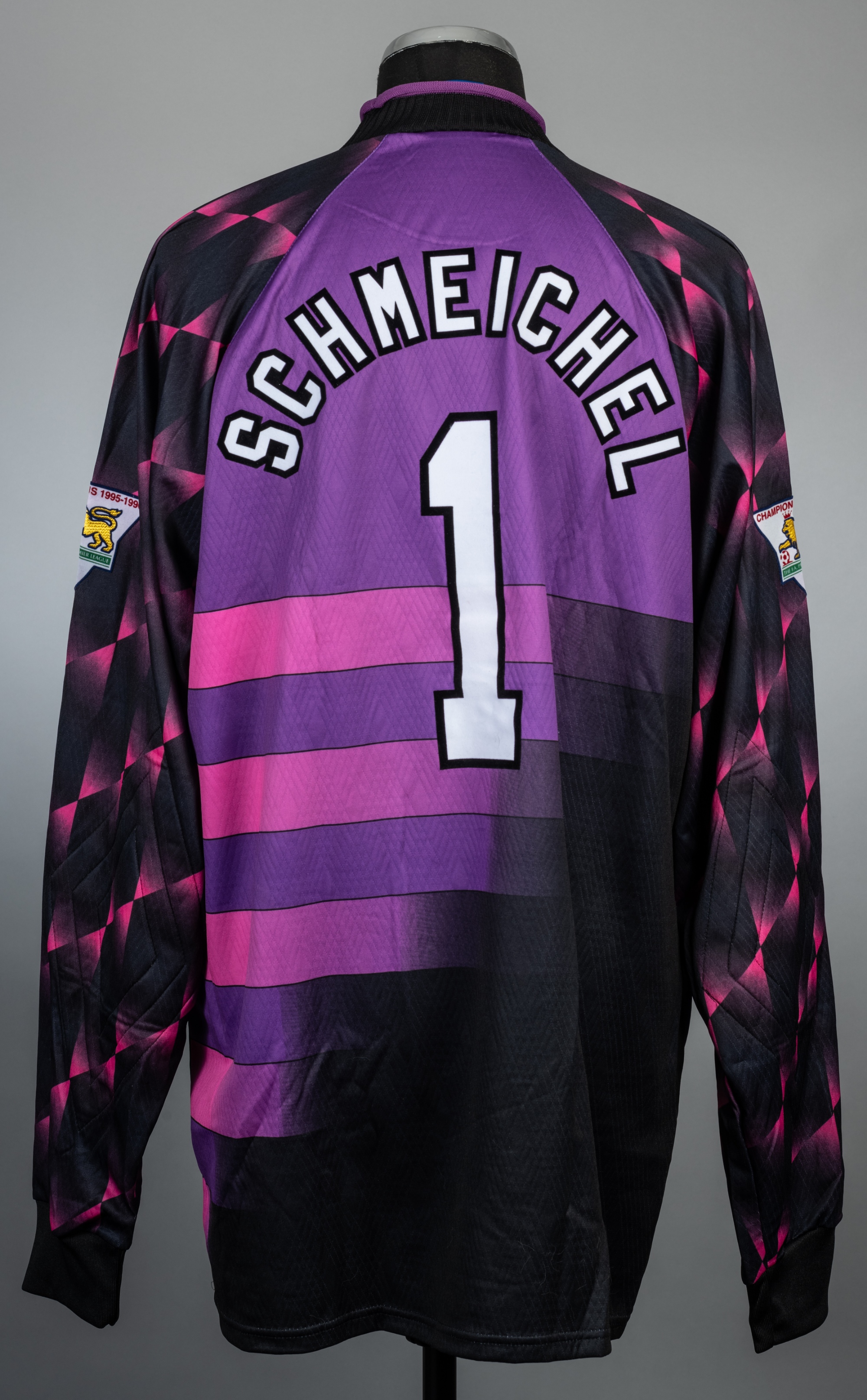 Peter Schmeichel purple and black Manchester United no.1 goalkeeper's jersey, season 1996-97, Umbro, long-sleeved with THE FA PREMIER LEAGUE CHAMPIONS 1995-1996 sleeve badges, club crest and sponsor logo, reverse lettered SCHMEICHEL, front lower seam embroidered MAN. UNITED F.C., size XXXL