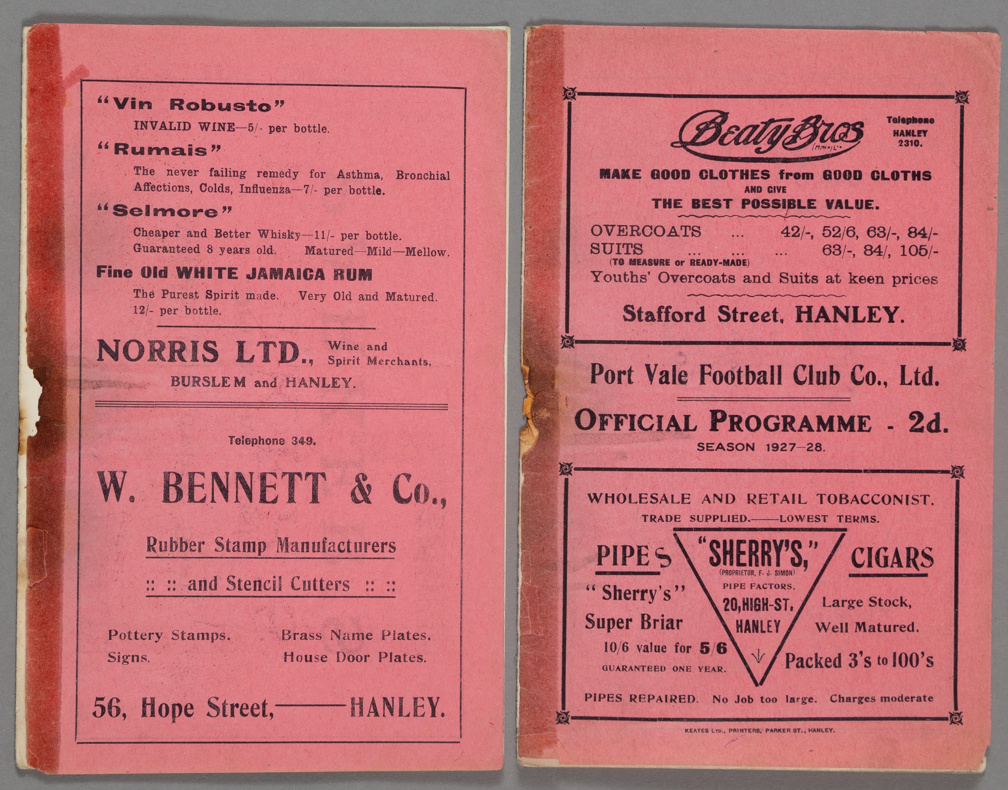 Two Port Vale home programmes, v Barnsley 14th January 1928 (FAC3) and F.L. Division Two v Stoke City 4th March 1933