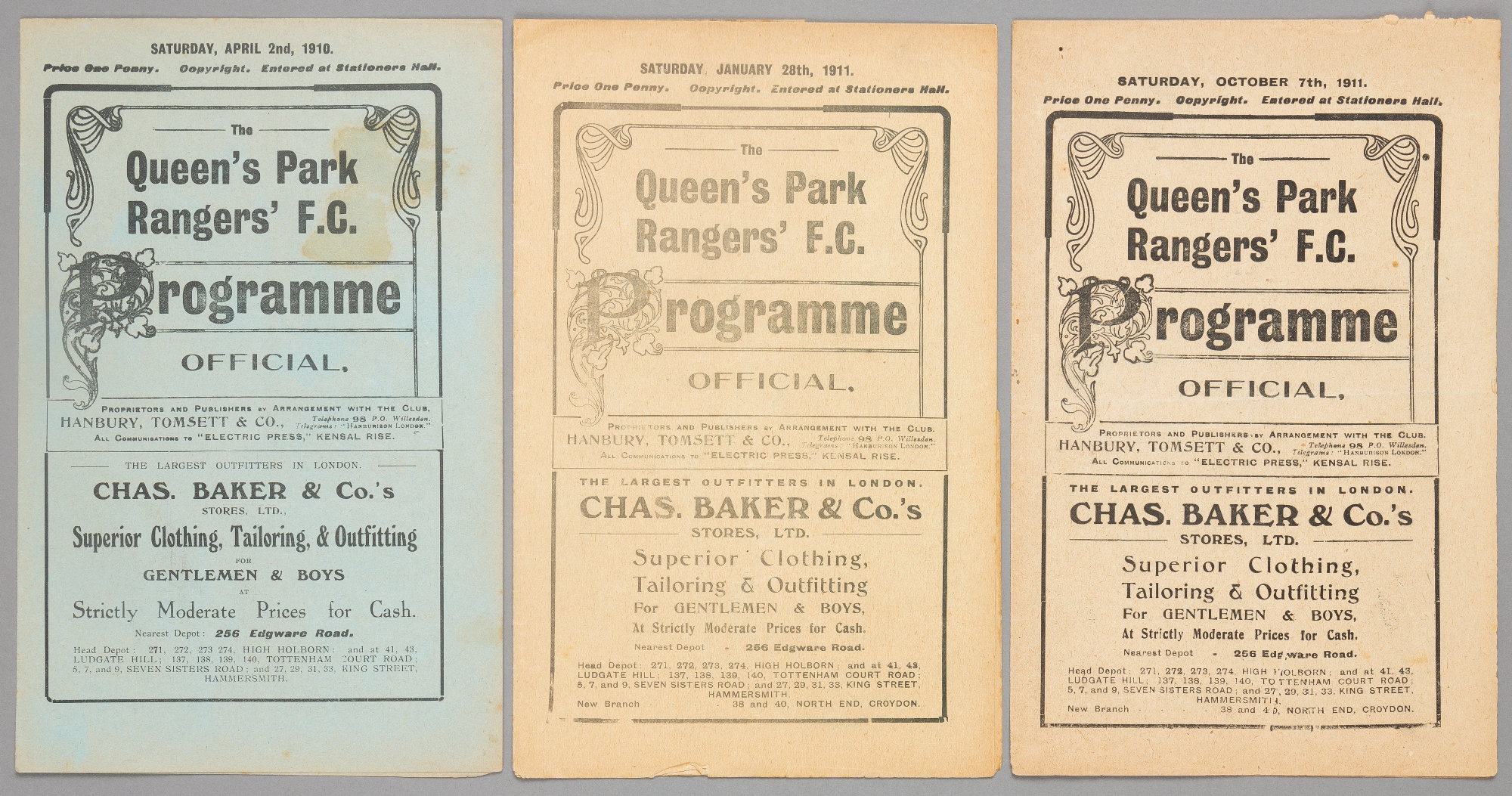 Three QPR home programmes, Southern F.L. Division One fixtures v Crystal Palace 2nd April 1910, Norwich City 28th January 1911 and Brentford 7th October 1911