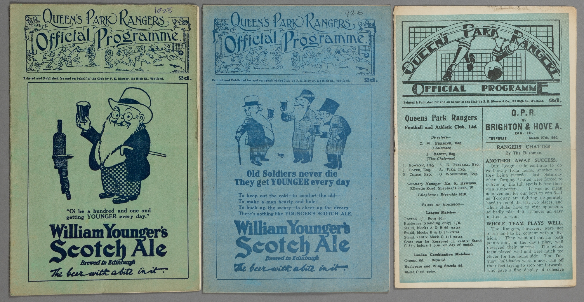 Three QPR home programmes, F.L. Division Three (South) v Watford 17th October 1925, Bristol City 25th September 1926 and Brighton & Hove Albion 27th March 1930