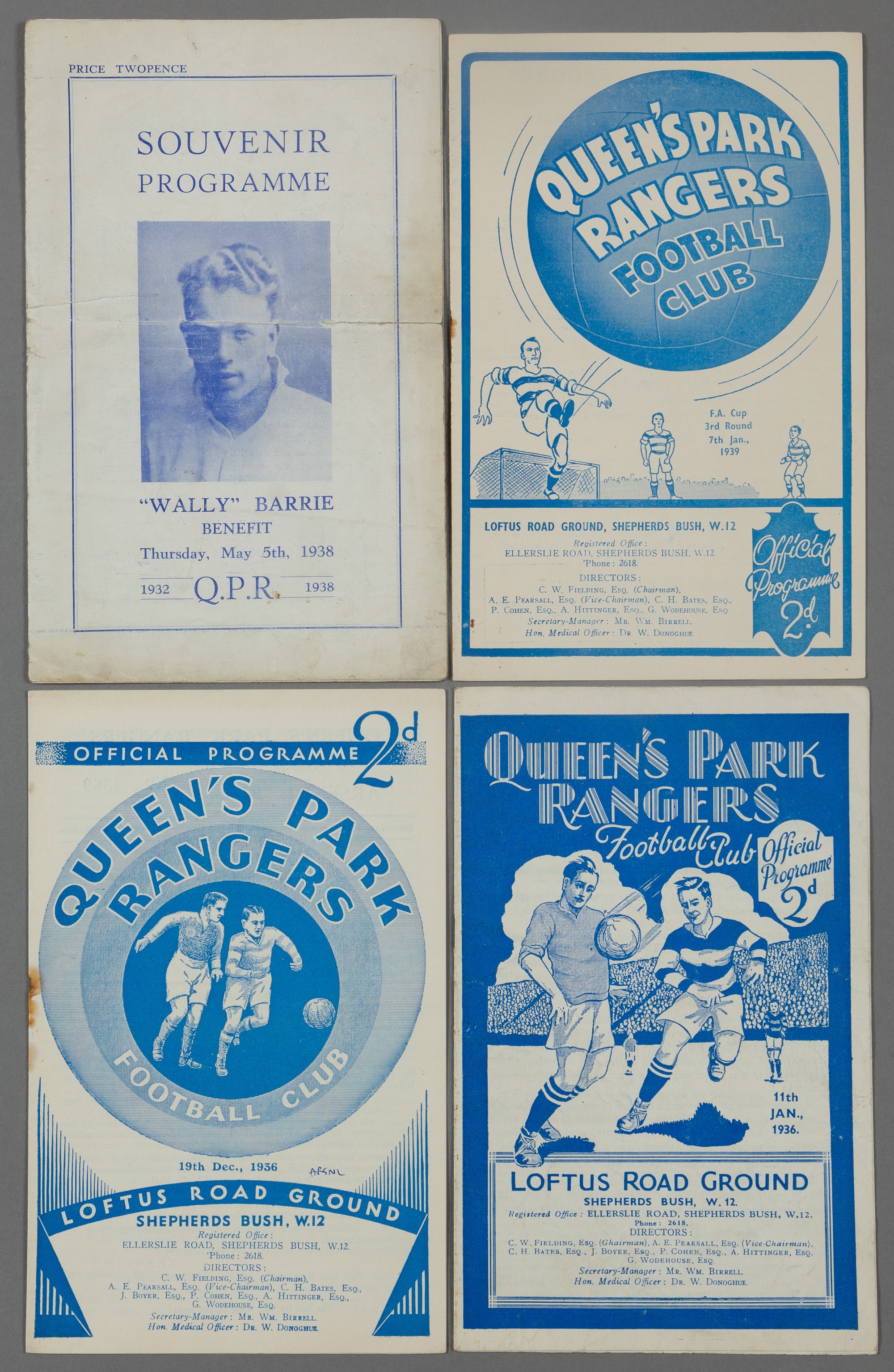Four QPR 1930s home programmes, v Corinthians 11th January 1936 (Friendly), Swindon Town 17th October 1936 (F.L. Division Three South), West Ham United 7th January 1939 (FAC3) and v Anglo-Scots 5th May 1938 for the Wally Barrie Benefit Match, (4)