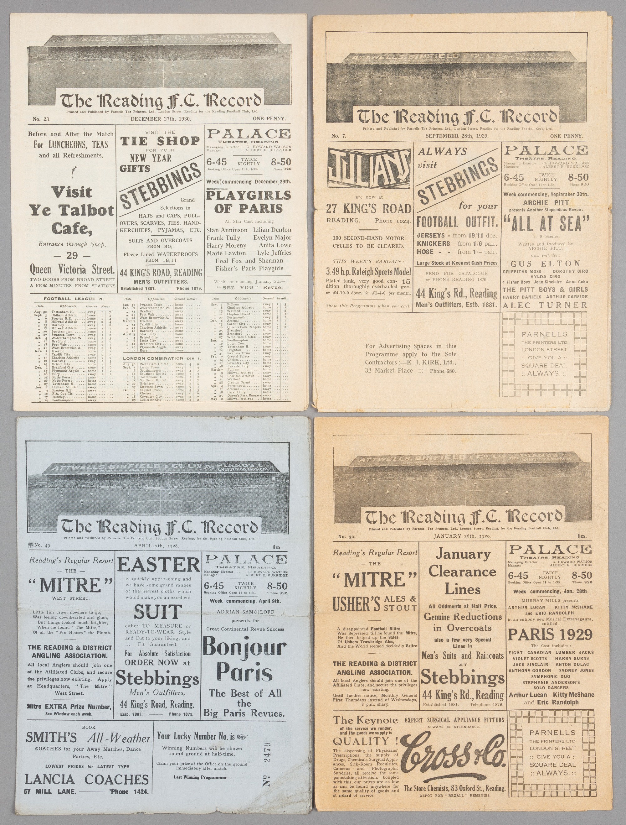 Four Reading home programmes dating between 1928 and 1930, F.L. Division Two fixtures, v Barnsley 7th April 1928, Portsmouth 28th September 1929 and Tottenham Hotspur 27th December 1930; and the F.A. Cup Fourt Round tie v Sheffield Wednesday 26th January 1929