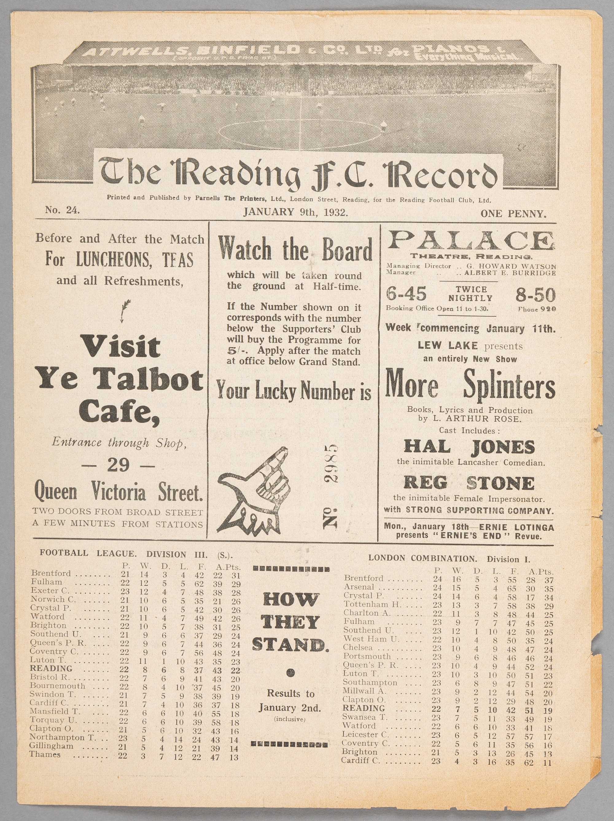 Reading v Thames programme 9th January 1932, F.L. Third Division South fixtures This was from AFC Thames's final season in the Football League. The