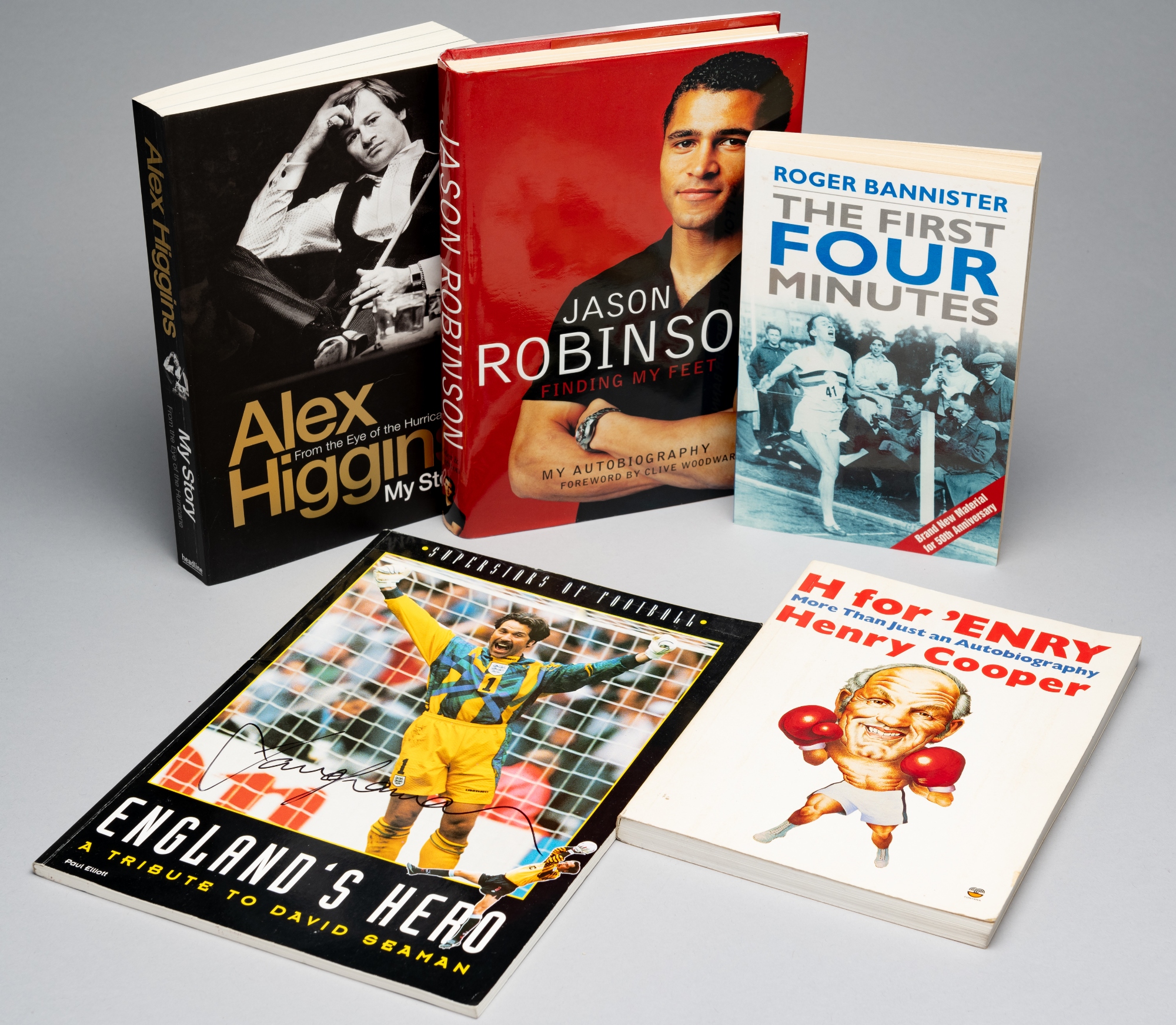 Signed books by sporting icons, including Sir Henry Cooper, David Seaman (signed twice), Alex Higgins, Jason Robinson, Sir Roger Bannister (dedicated), (5)