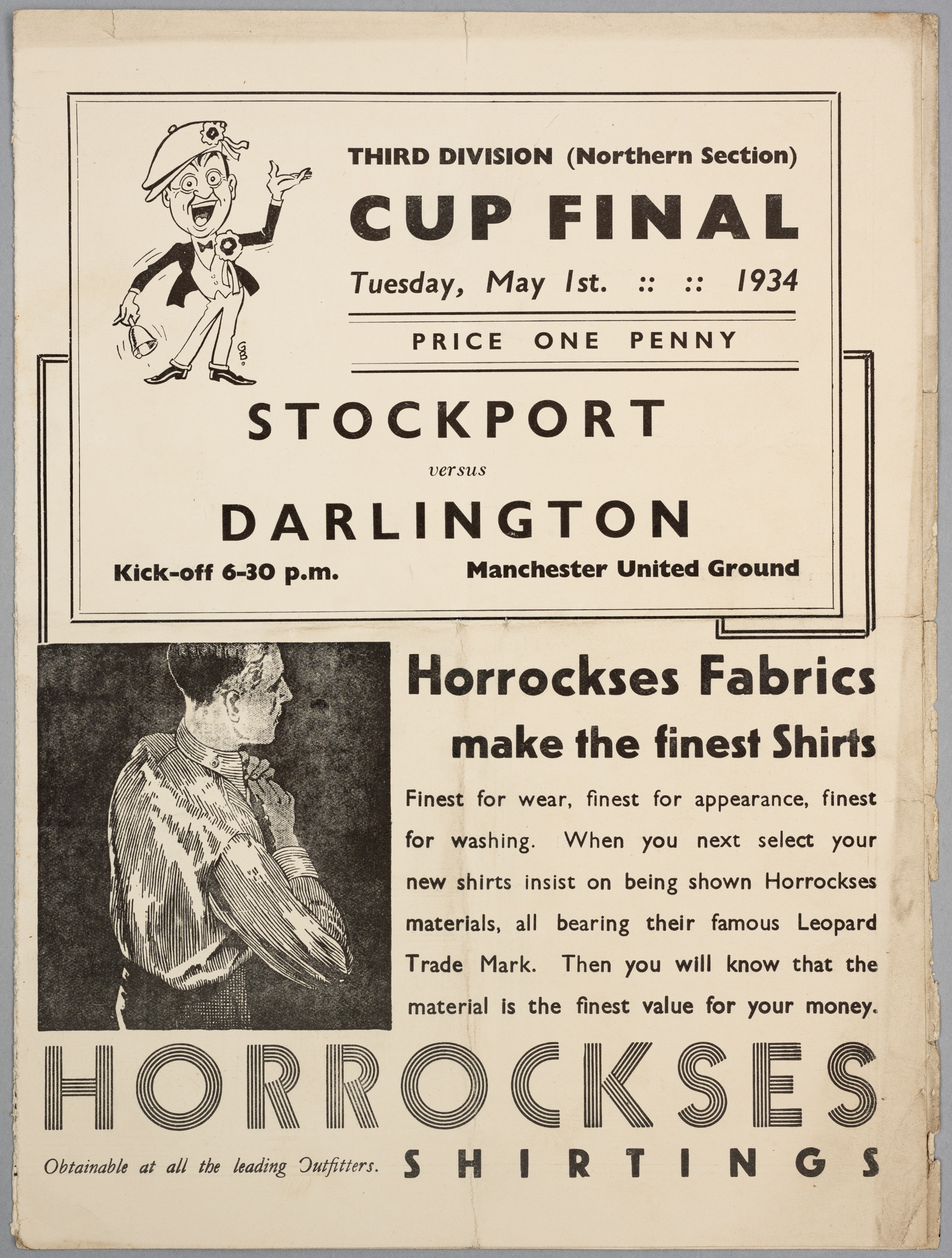 A rare programme for the Third Division (Northern Section) Cup Final Stockport v Darlington, played at Manchester United's Old Trafford ground, 1st May 1934, 4-page, marks to margins, tears, pencil scores This was a short lived competition played for between 1933 and 1939, and 1945 and 1946. In an exciting match Darlington defeated Stockport 4-3.