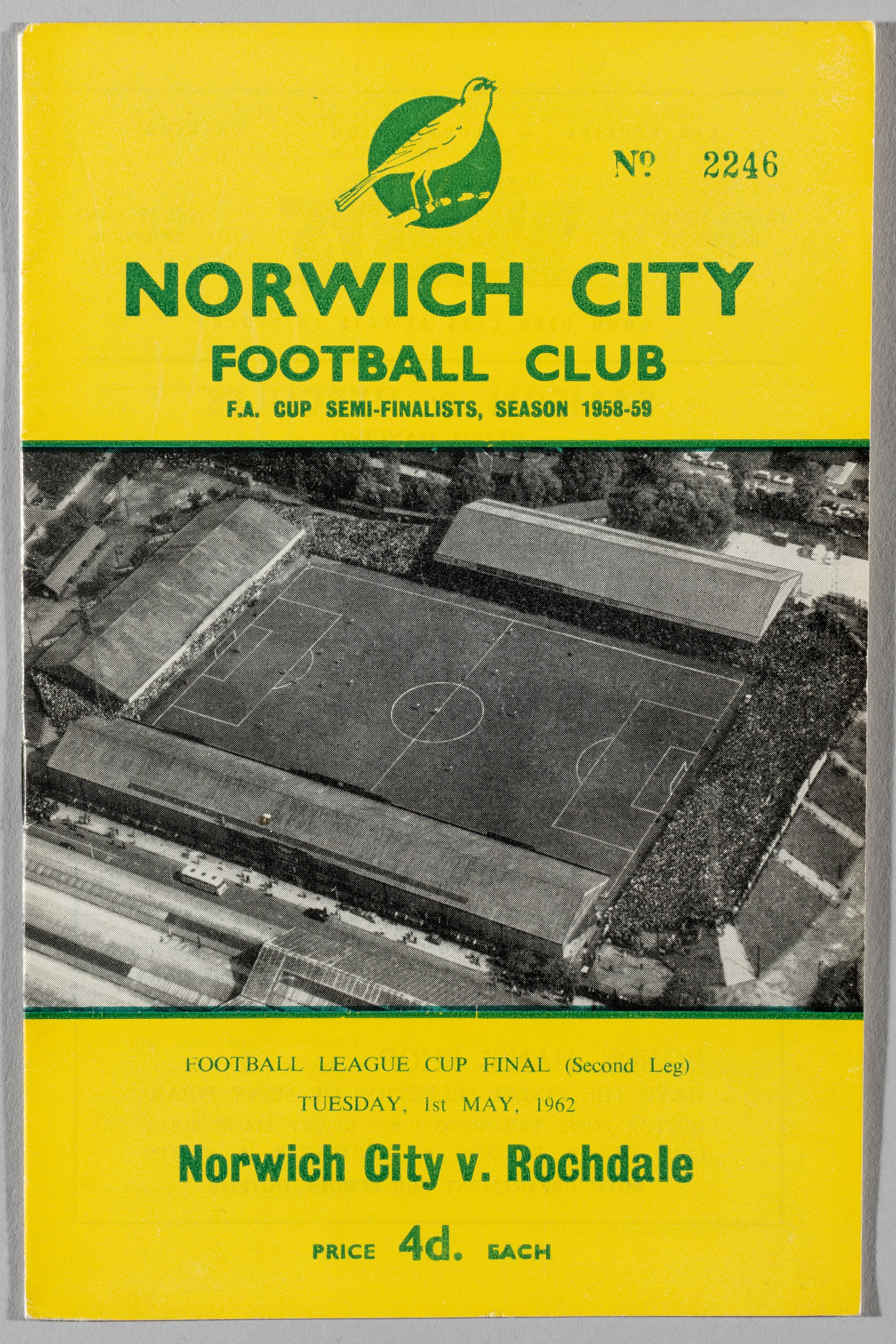 1962 Football League Cup Final programme for second leg Rochdale v Norwich, played at Norwich, 1st May 1962, 12-page with illustrated cover, clean condition