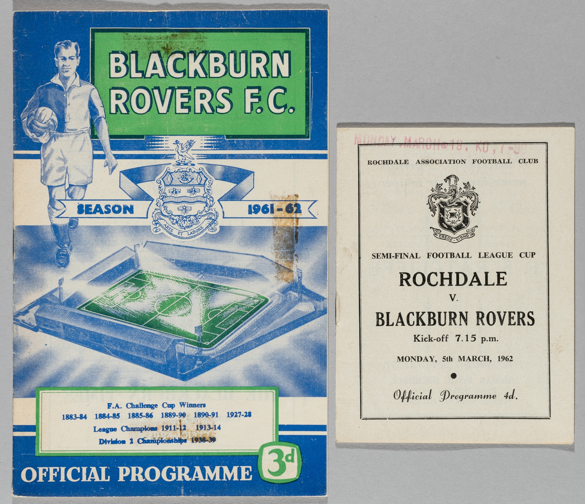 Football League Cup semi-final programme Rochdale v Blackburn Rovers first leg at Blackburn, 2nd April 1962, second leg at Rochdale original date 5th March 1962 but actually played 19th March 1962, programme has revised date stamped to front in red, other bears stain to front and reverse, vertical crease (2)