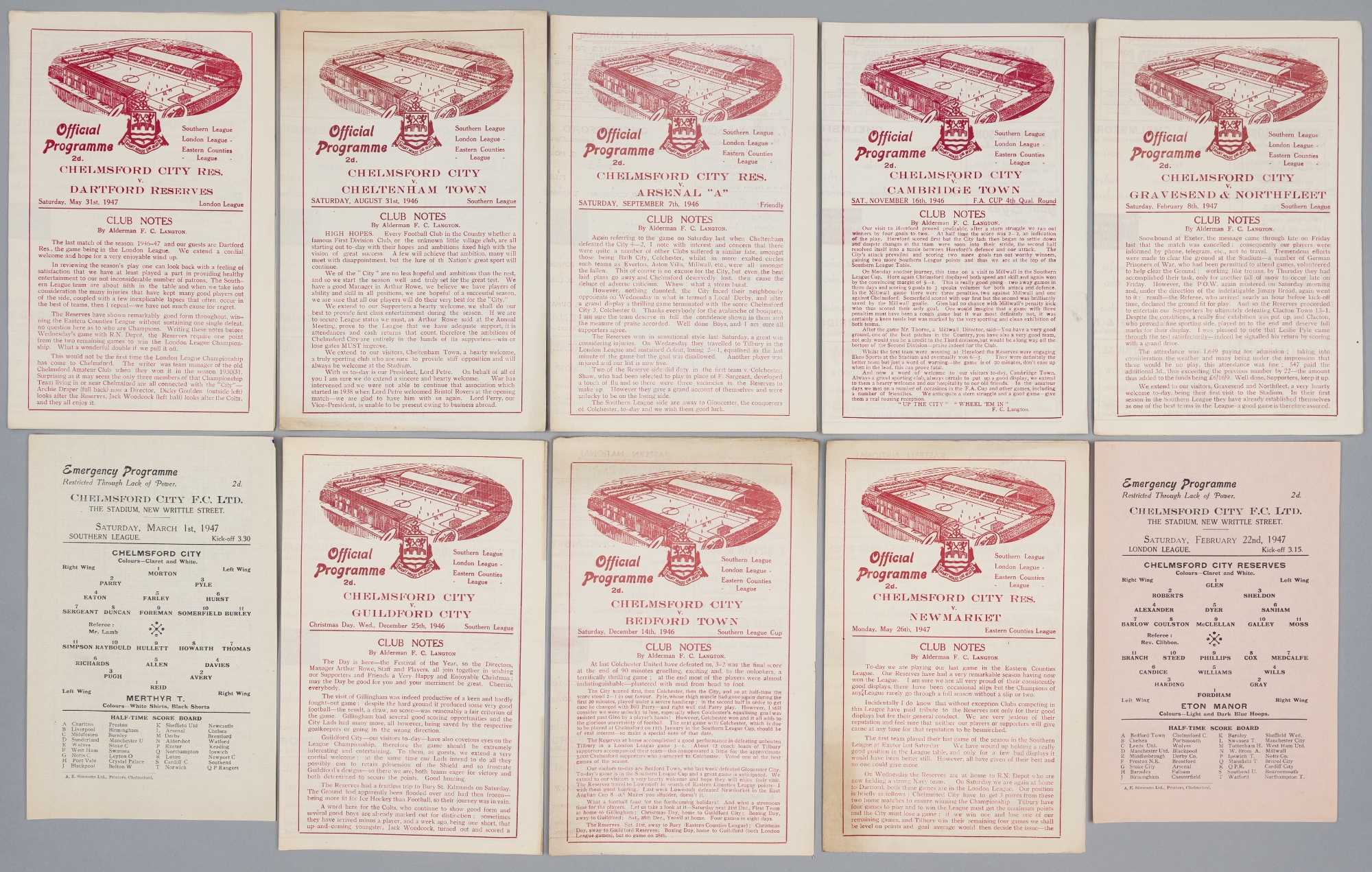 Chelmsford FC home programmes, season 1946-47, four-page editions, covering first team, reserves playing in the Southern League, London League, Easte