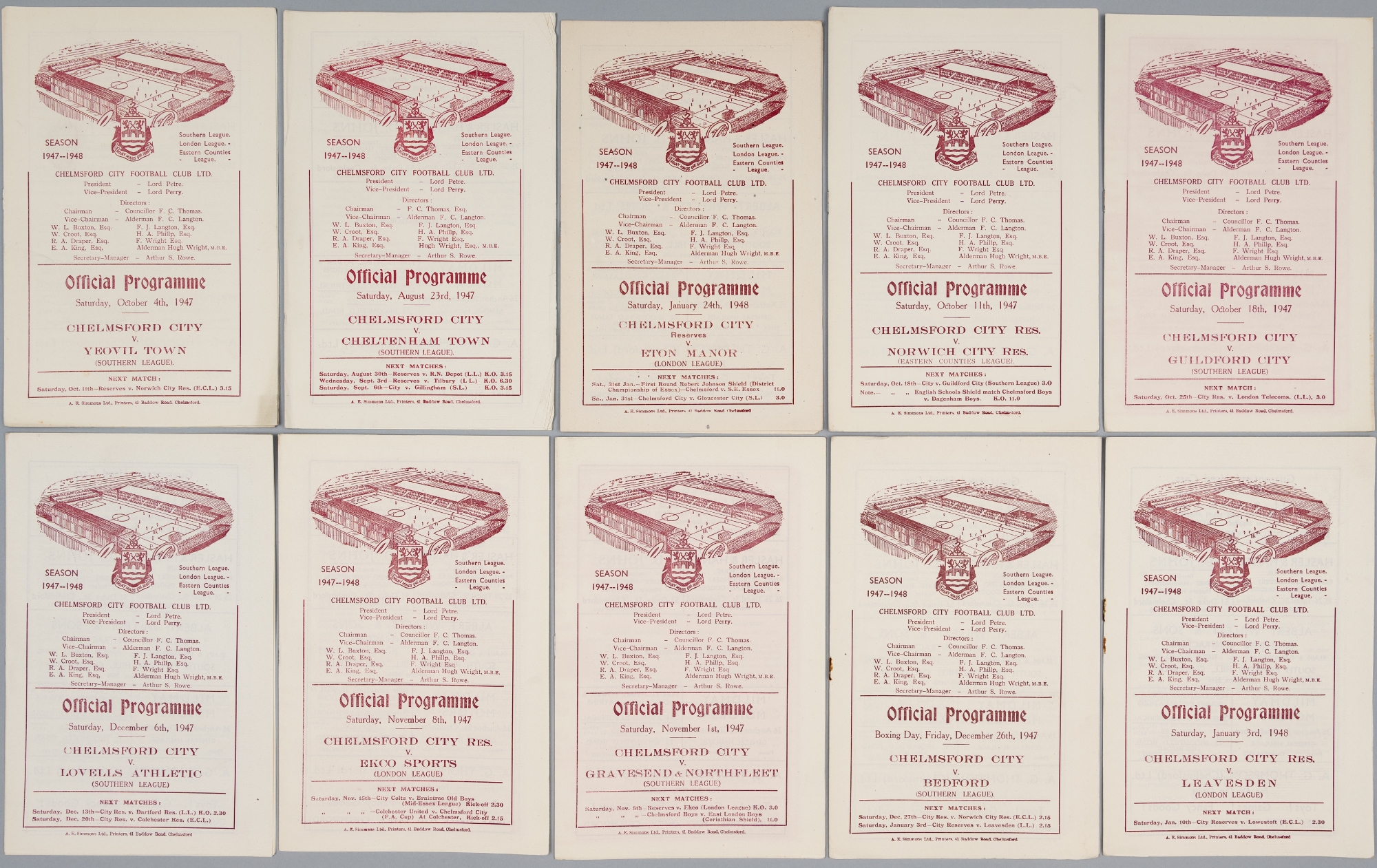 Chelmsford FC home programmes, season 1947-48, full season covering first team, reserves playing in Southern League, London League and Eastern Count