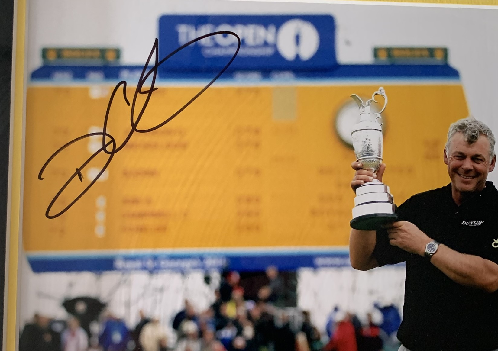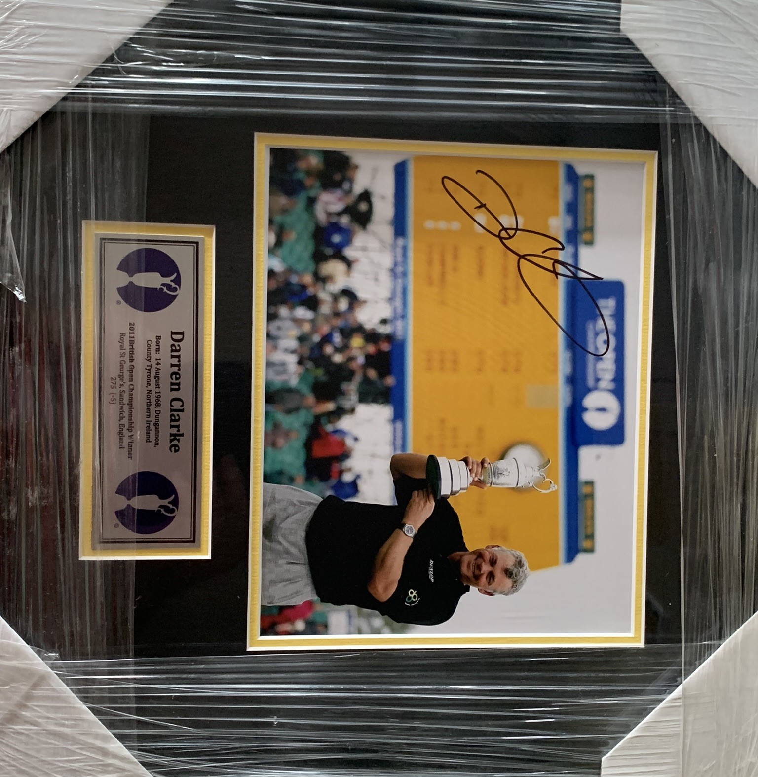 Darren Clarke (UK) signed / framed 8 by 10in. photograph, 2011 Royal St Georges, Open Championship (Clarke was winner), Professionally framed with double mattes and plaque on Clarke’s Open win. Frame Size: 40 by 42cm. COA and photo proof included.