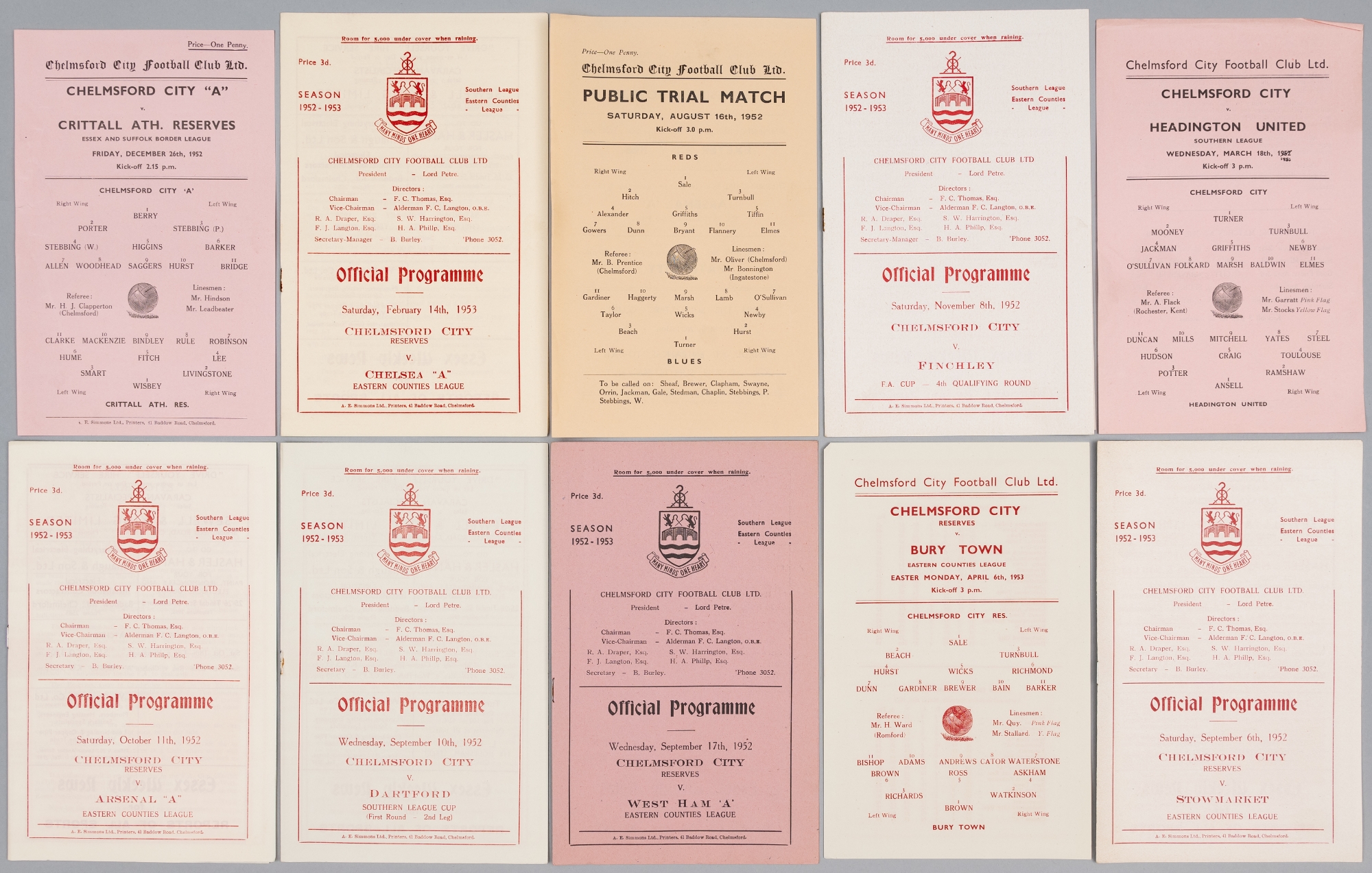 Chelmsford FC home programmes, season 1952-53, covering first team and reserves playing in Southern League Eastern Counties, including Reds v Blues S/S Trial 16th August 1952, v Exeter City Reserves 27th August 1952, v West Ham 'A' 17th September 1952, v Finchley FAC 8th November 1952, v Norwich City 'A' 31st January 1953, v Headington S/S 18th March 1953, v Arsenal 'A' 3rd April 1953, some single programmes, majority in good condition with little wear, some bearing stains near the staple area, (53)