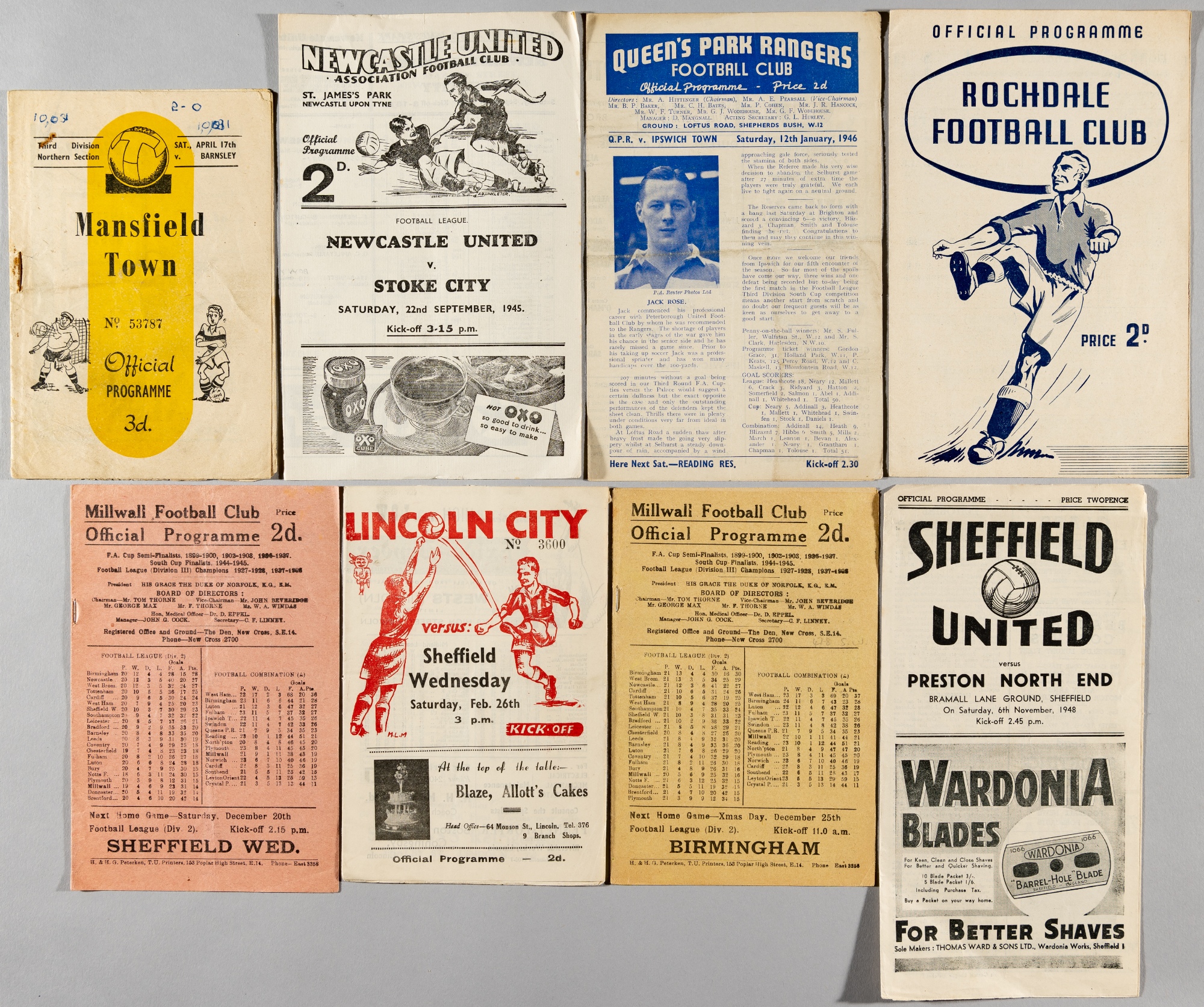 Selection of football programmes from 1941-42 to 1949-50, including single sheets, 4-page editions, Arsenal v West Ham United 1942-43, Chelsea v Brighton & Hove Albion 1944-45, Darlington v Halifax 1945-46, Port Vale v Walsall 1948-49, Rochdale v Chester 1948-49, Millwall v Sheffield Wednesday 1947-47 and more, each with wear, some page edge wear and creases, horizontal and vertical folds, some spine wear with tears and holes, pen annotations, (40)
