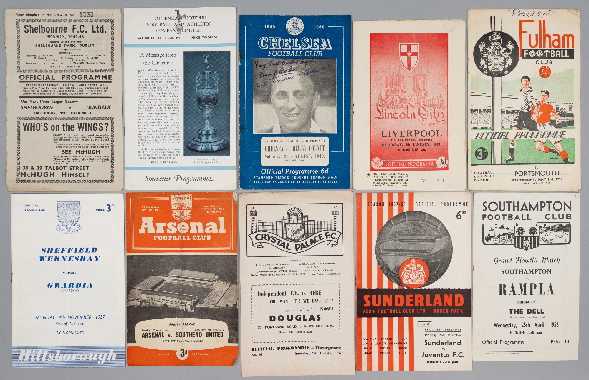 Football programme selection, 1950s, including good selection of clubs noted Port Vale Cup run to Semi-final 1953-54 (5); Chelsea v International teams (7); Southampton v Rampla, Argentina (F) 25th April 1956; Torquay v Millwall 1951-52; Shelbourne v Brideville 1942-43; Doncaster Rovers v Djurgarden 1952-53; Portsmouth v Chelsea 1952-53, fair to good condition, with wear to majority of programmes, wear and stains apparent, some with splits/tears, folds and creases, pencil and ink annotations, (14)