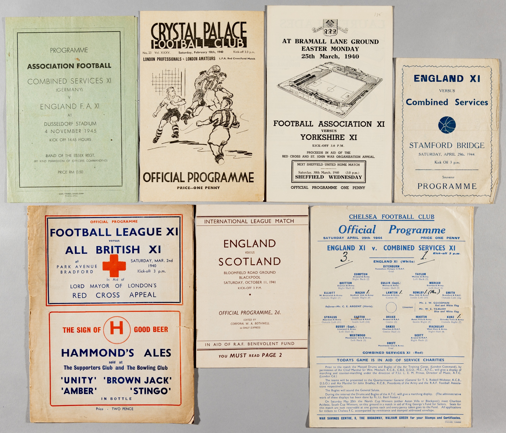 Wartime selection representative programmes, including Combined Services XI Germany v England FA XI in Dusseldorf 4th November 1945, England v Scotland league match at Blackpool 11th October 1941, London Professionals v London Amateurs LFA Red Cross Fund played at Crystal Palace 10th February 1940, England XI v Combined Services XI at Chelsea 29th April 1944, plus 'Pirate' programme for same match by Bloom, each with wear, some annotations, folds/creases, spines fragile, tears, marks and stains, (7)