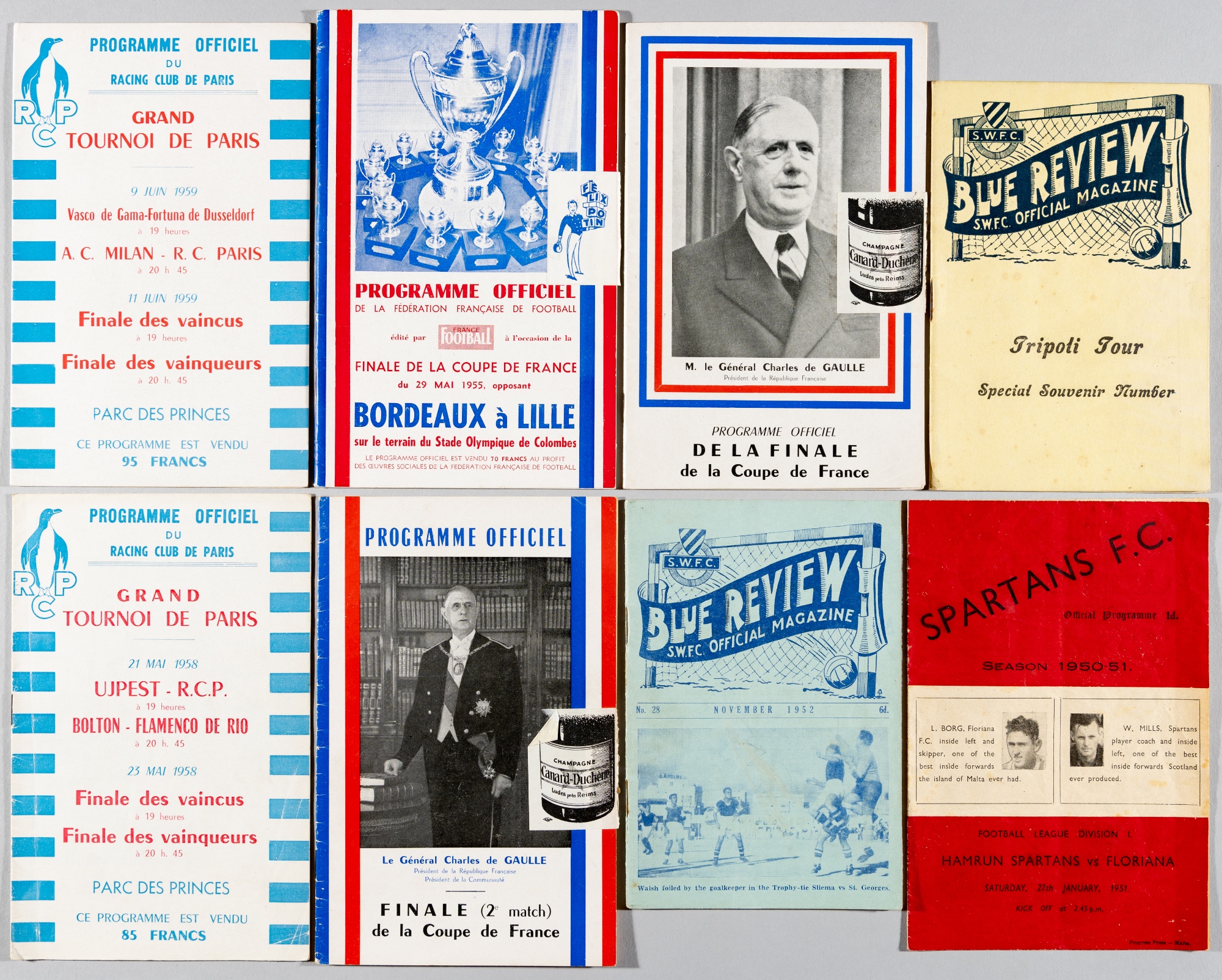 Overseas programmes selection from the 1950s, includes Germany (8), German Cup final Hamburg v FC Shalke 04 18th May 1958, Hamburg v Real Madrid 11th April 1963, Japan (5), Brazil (3), Australia (4), Malta (14) Floriana v Hibernian 5th November 1949, New Zealand (7), South Africa (25) Frontier v Australia 15th July 1950, USA (5), France (6) Bordeaux v Lillie French Cup final 1955, Le Harve v Sochaux French C/F and replay 1959, fair to good with wear to covers and spines, some creases and annotations, (77)
