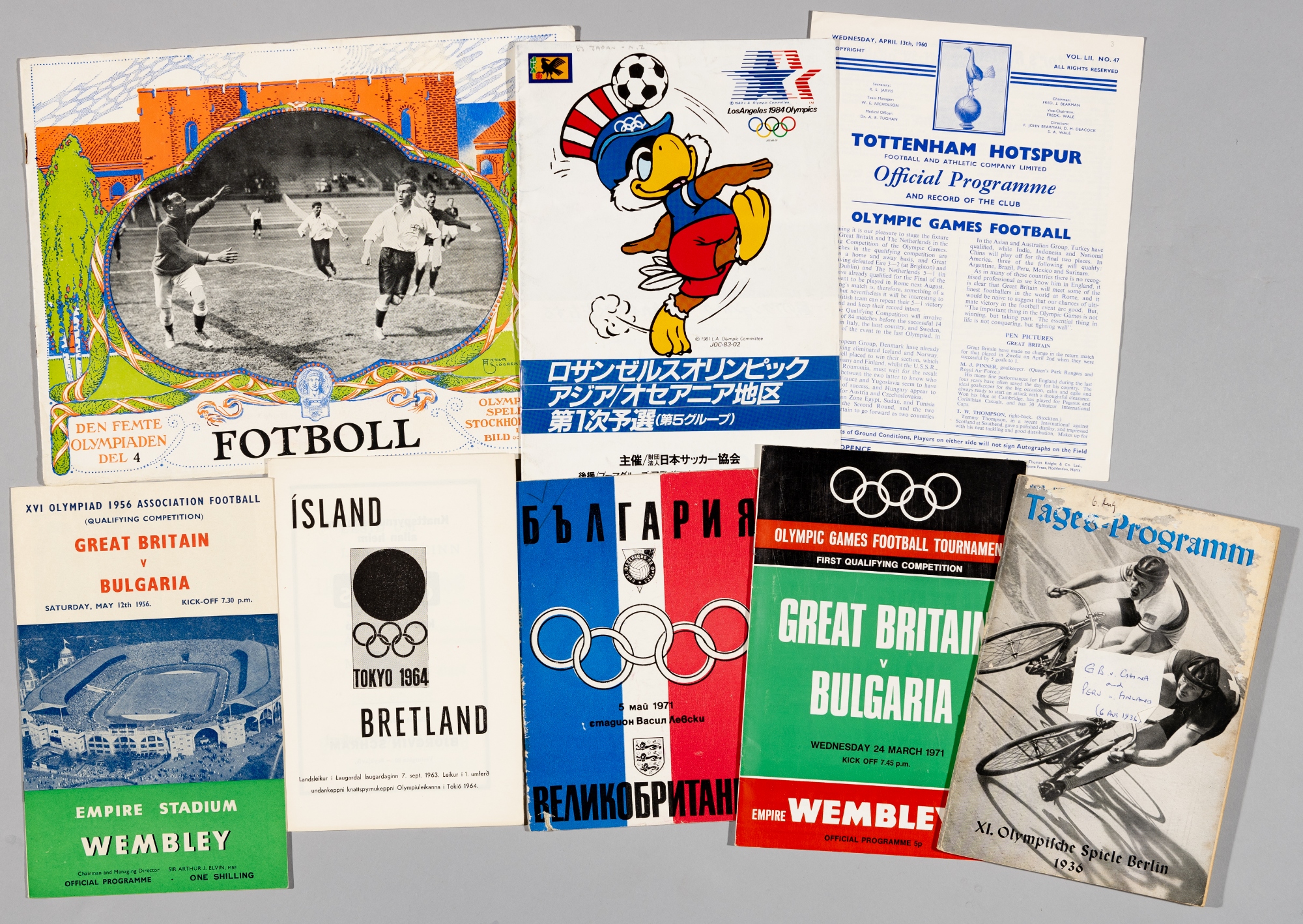 Mixed selection of Olympic Games football items, includes Stockholm 1912 football brochure, wear to cover edges, loss to back cover; 1936 Olympic Games programme includes Great Britain v China, wear to cover with paper losses; Great Britain v Bulgaria Home 24th March 1971 and Away 5th May 1971 (wear to spine, paper loss to lower spine on both sides), Island v Great Britain 7th September 1963; Great Britain v Netherlands at Tottenham 13th April 1960, bears score ink annotation; Japanese brochure Los Angeles 1984; Great Britain v Bulgaria 12th May 1956 at Wembley (8)