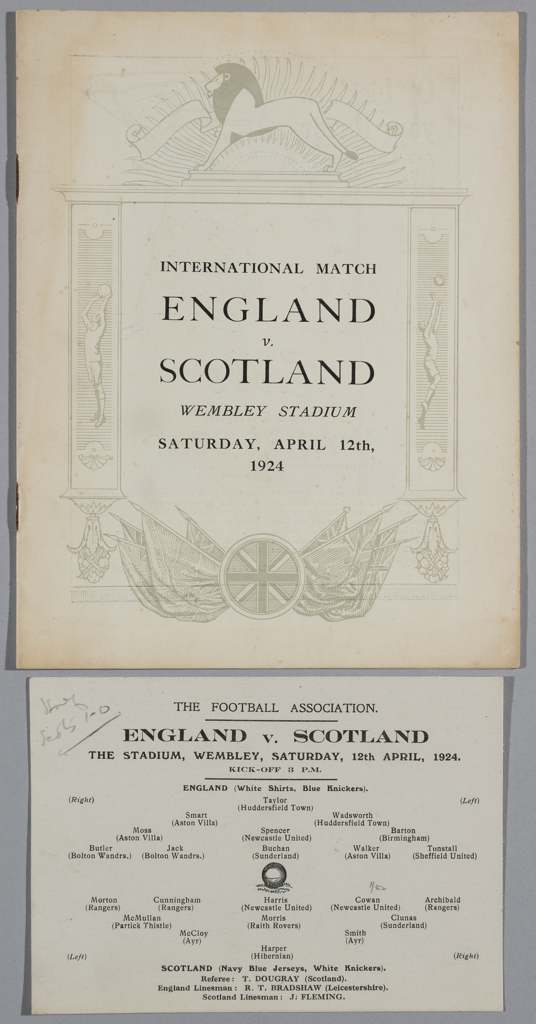 England v Scotland international match programme and team line-up card, played at Wembley Stadium, 12th April 1924, 24-page programme, lacking original colour paper wrappers, bears minor wear and discolouration on cover page edges, slight rusty staples; sold with F.A. England v Scotland team line-up card, bearing pencil annotations, good condition, (2)