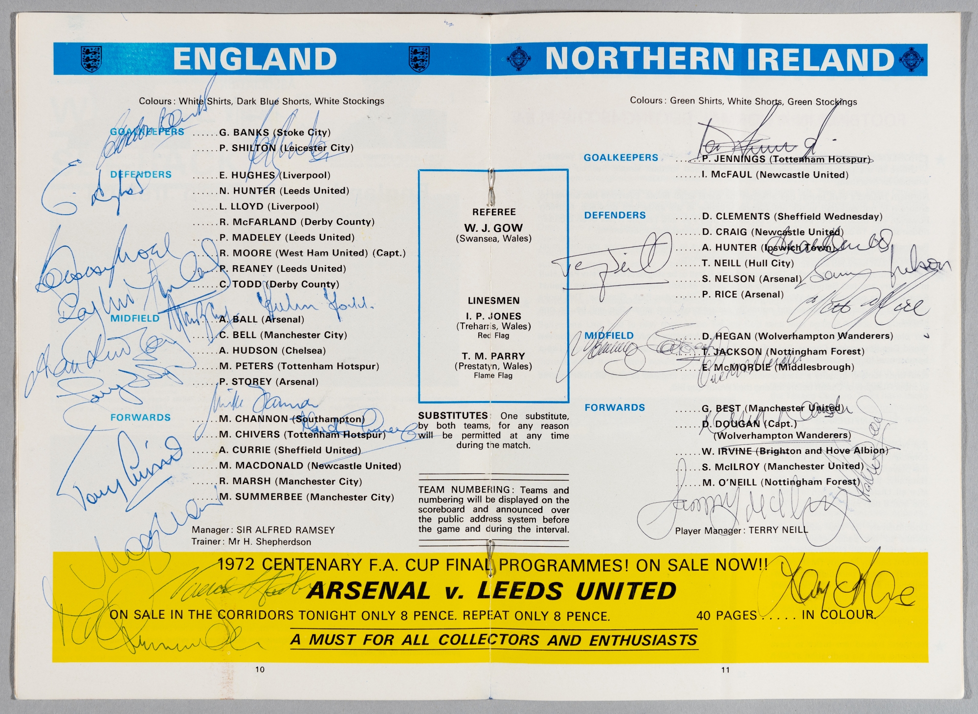 Signed England v Northern Ireland British Championship programme, played at Wembley, 23rd May 1972, 20-page programme, signed on centre line-up page in blue and black ink by both teams, England by 15 players including Moore, Ball, Hunter, Banks, Hughes, etc; Norther Ireland by 11 players including Jennings, Rice, Dougan, McIlroy, etc., good condition with little wear, minor creases