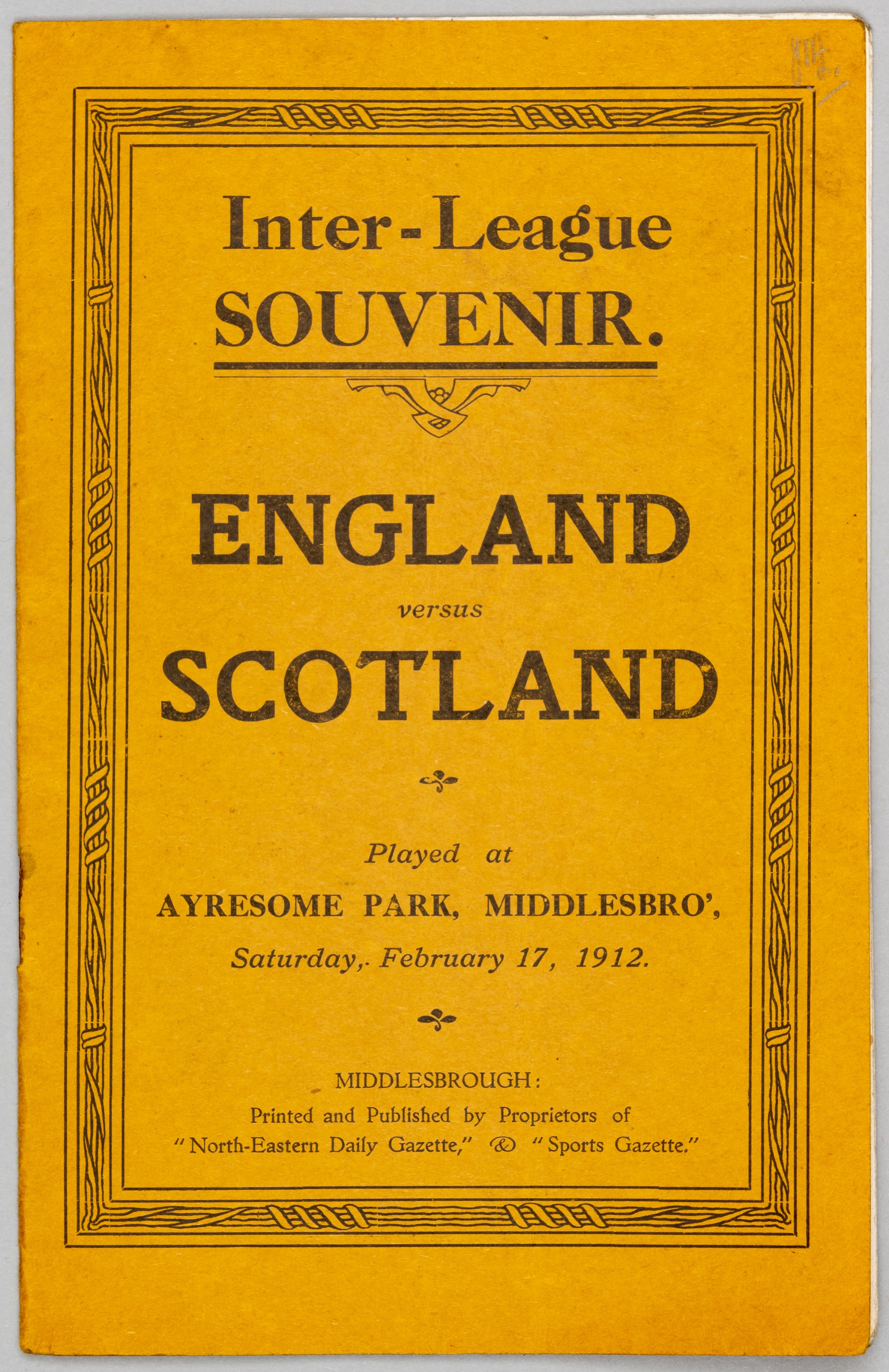 England v Scotland Inter-league match programme, played at Middlesbrough, 17th February 1912, 16-page programme with printed gold coloured cover, ver