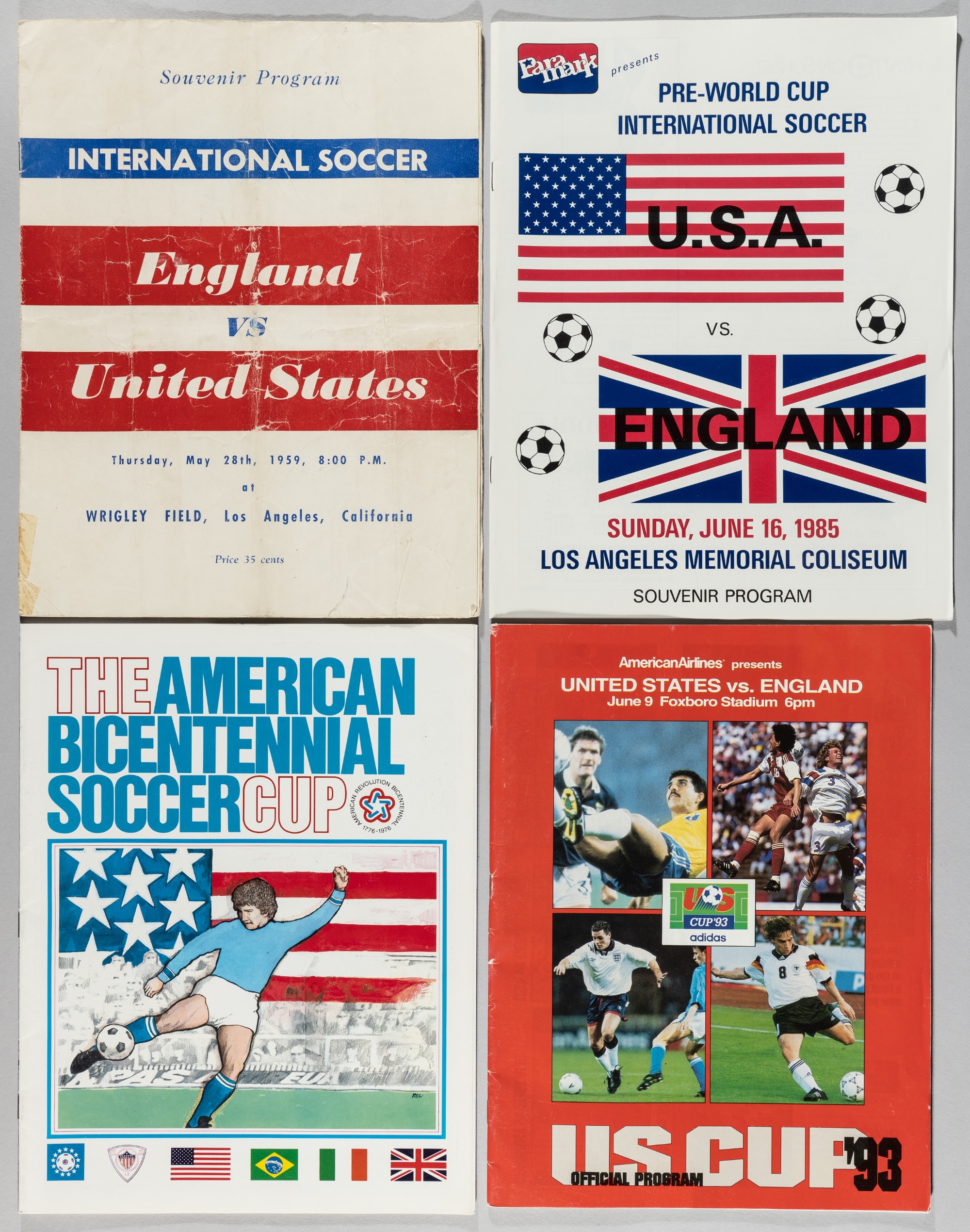 England away programmes v United States, includes rare 28th May 1959 at Wrigley Field Los Angeles; 27th May 1964; New York 1976 Bi-centennial tournament Los Angeles / New York, 16th August 1985; Los Angeles 9th June 1993 US 93 tournament, Massachusetts, majority good, light creasing, first programme fragile with repairs and folds, (5)