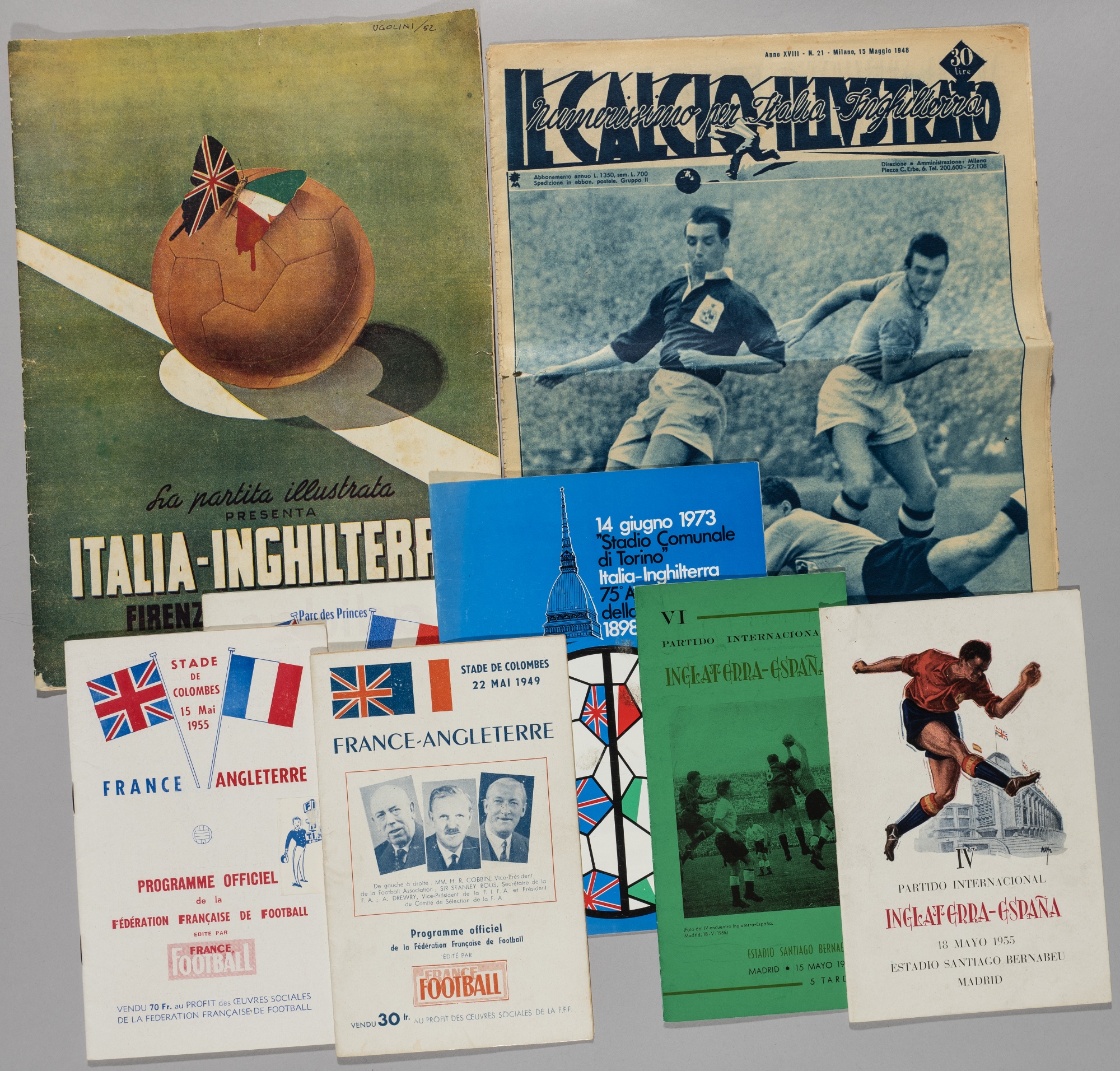 England away programmes v Spain, France & Italy, 1955-73, v Spain 18/5/1955, 15/5/1960; v France 22/5/1949, 15/5/1955, 27/2/1963; Italy IL Calcio Illustrated 15/5/1948 for match played in Turin 16/5/1948; La Partita Illustrated Florence 18/5/1952 tram line-ups for both teams; 14/7/1973 75th Anniversary in Turin, fair, each with wear, creases, discolouration, folds and stains, page edge tear and annotations, (8)