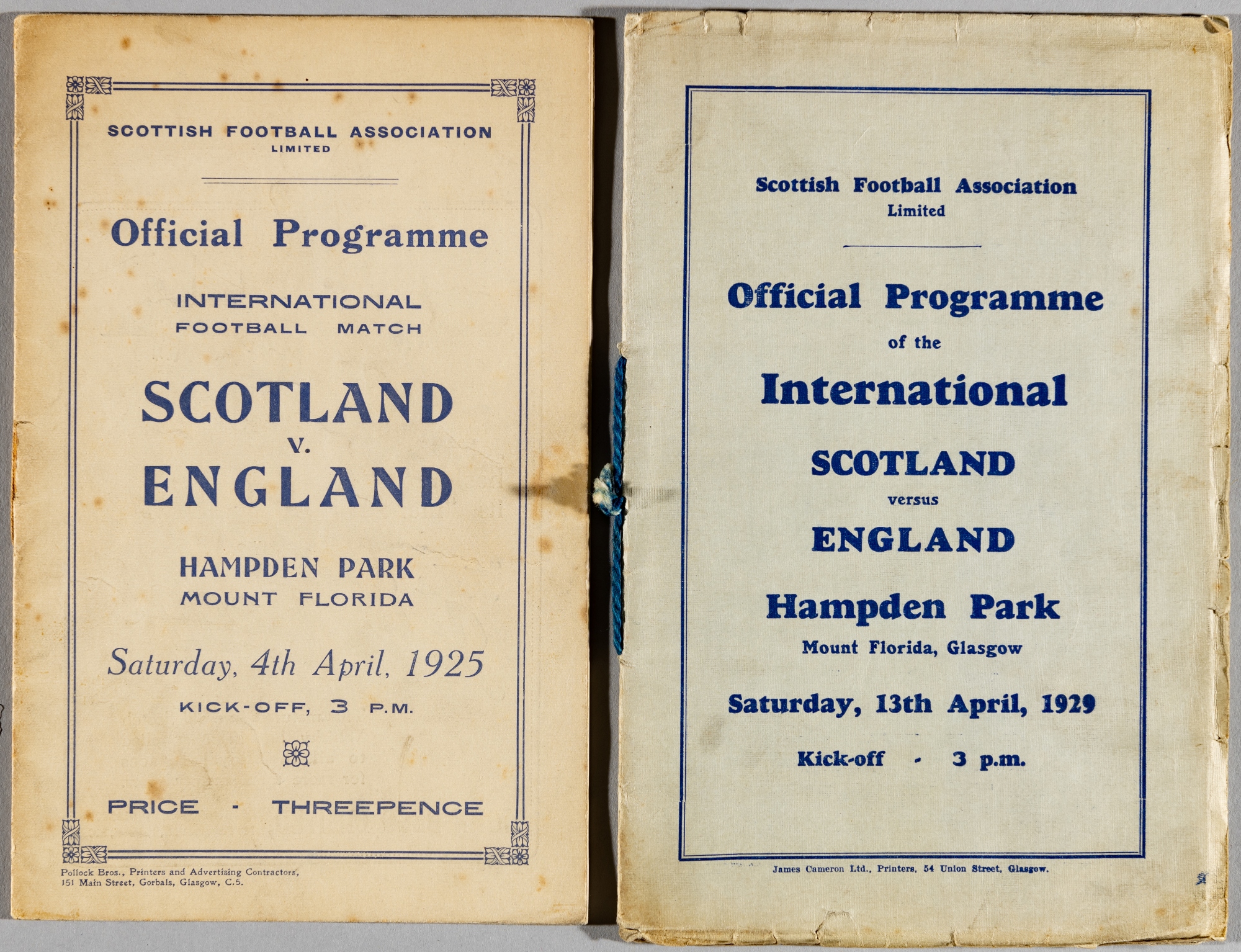 Two Scotland v England official programmes, both played at Hampden Park, 4th April 1925 and 13th April 1929, each bearing wear to cover, some foxing