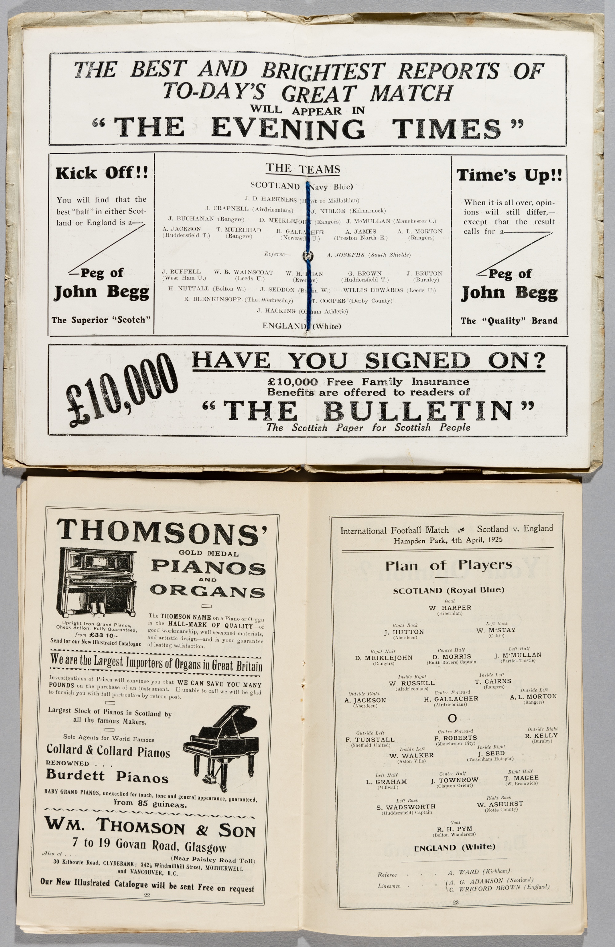 Two Scotland v England official programmes, both played at Hampden Park, 4th April 1925 and 13th April 1929, each bearing wear to cover, some foxing and page edge wear, (2)