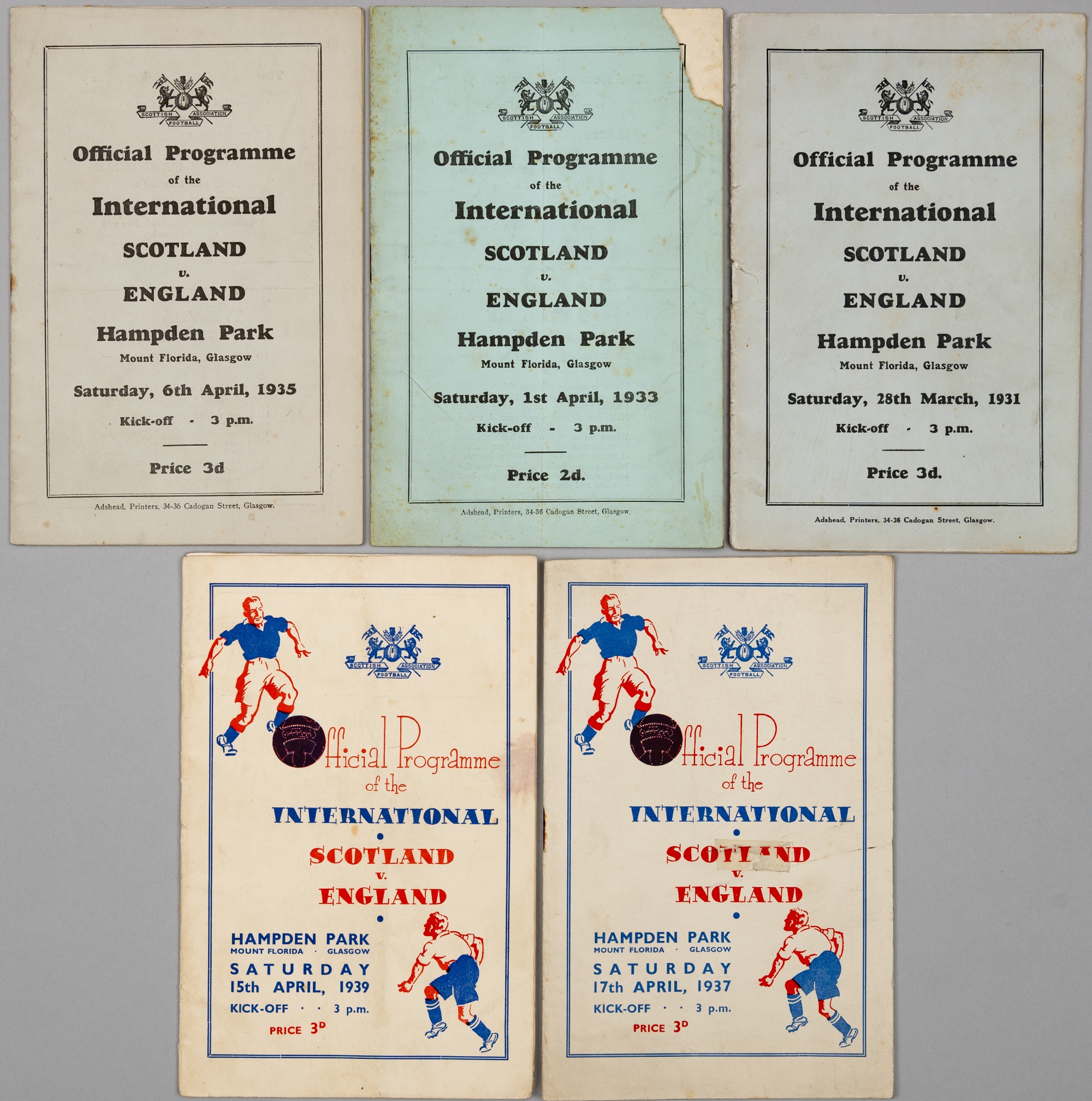 Scotland v England international programmes, all played at Hampden Park in the 1930s, includes 28th March 1931; 1st April 1933, lacking small corner from front page; 6th April 1935; 17th April 1937, with song sheet; 15th April 1939, (5)