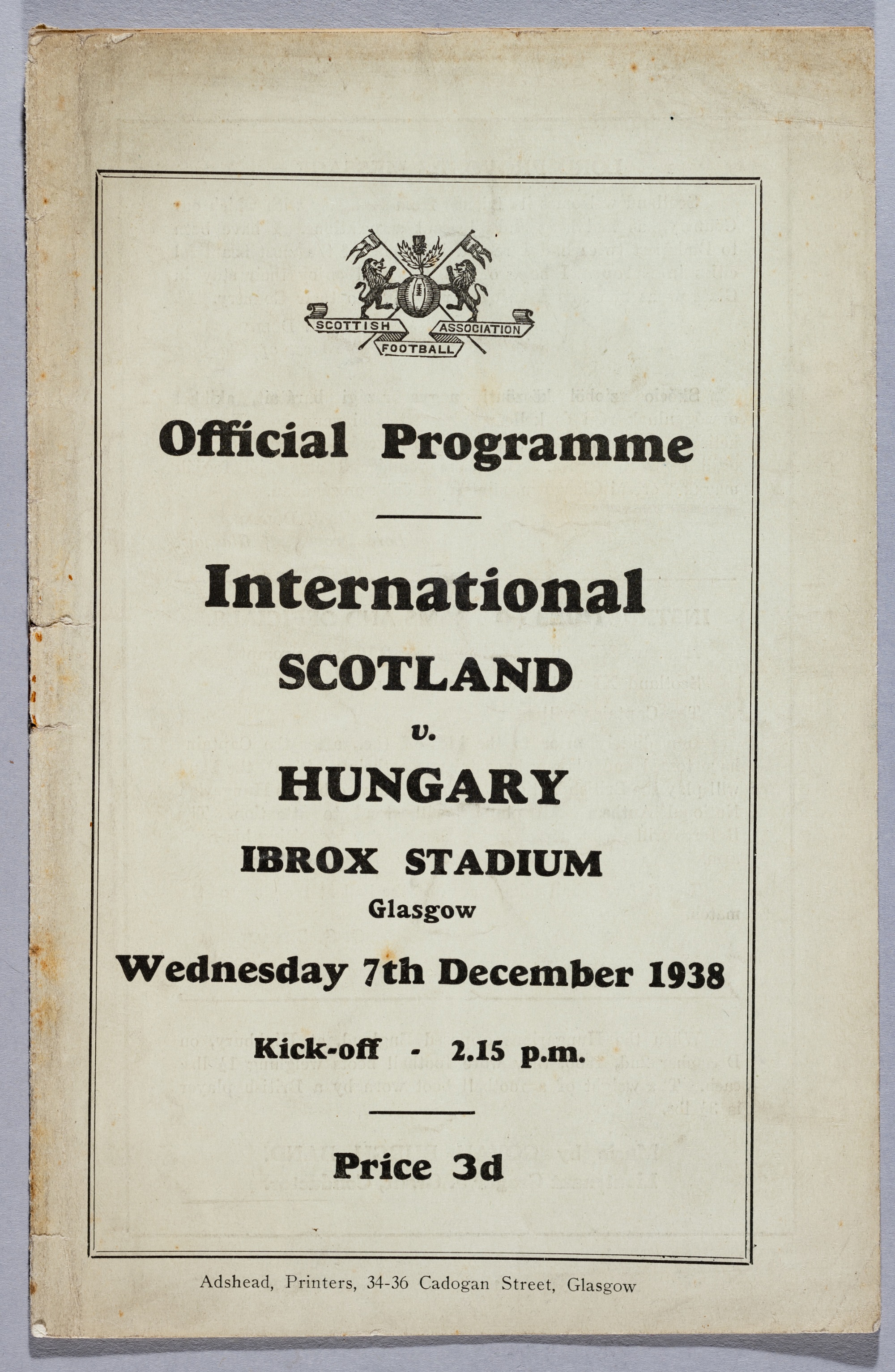 Scotland v Hungary football programmes, played at Ibrox Stadium, 7th December 1938, 12-page programme, with centre team line-up page, bears slight damage at staple area on cover, some stains