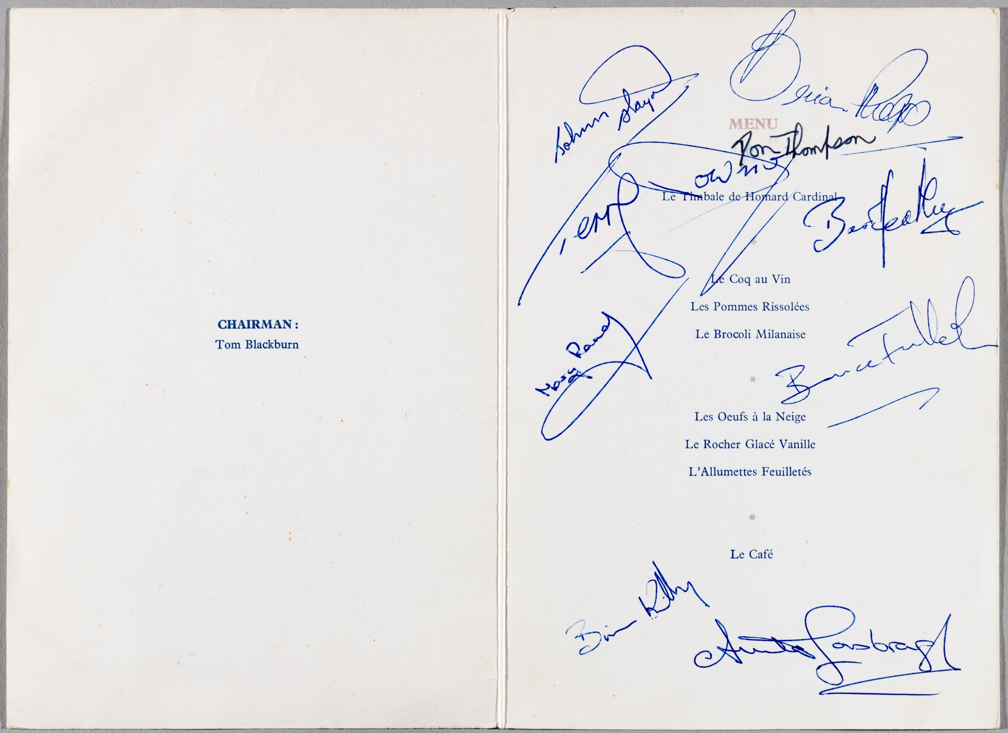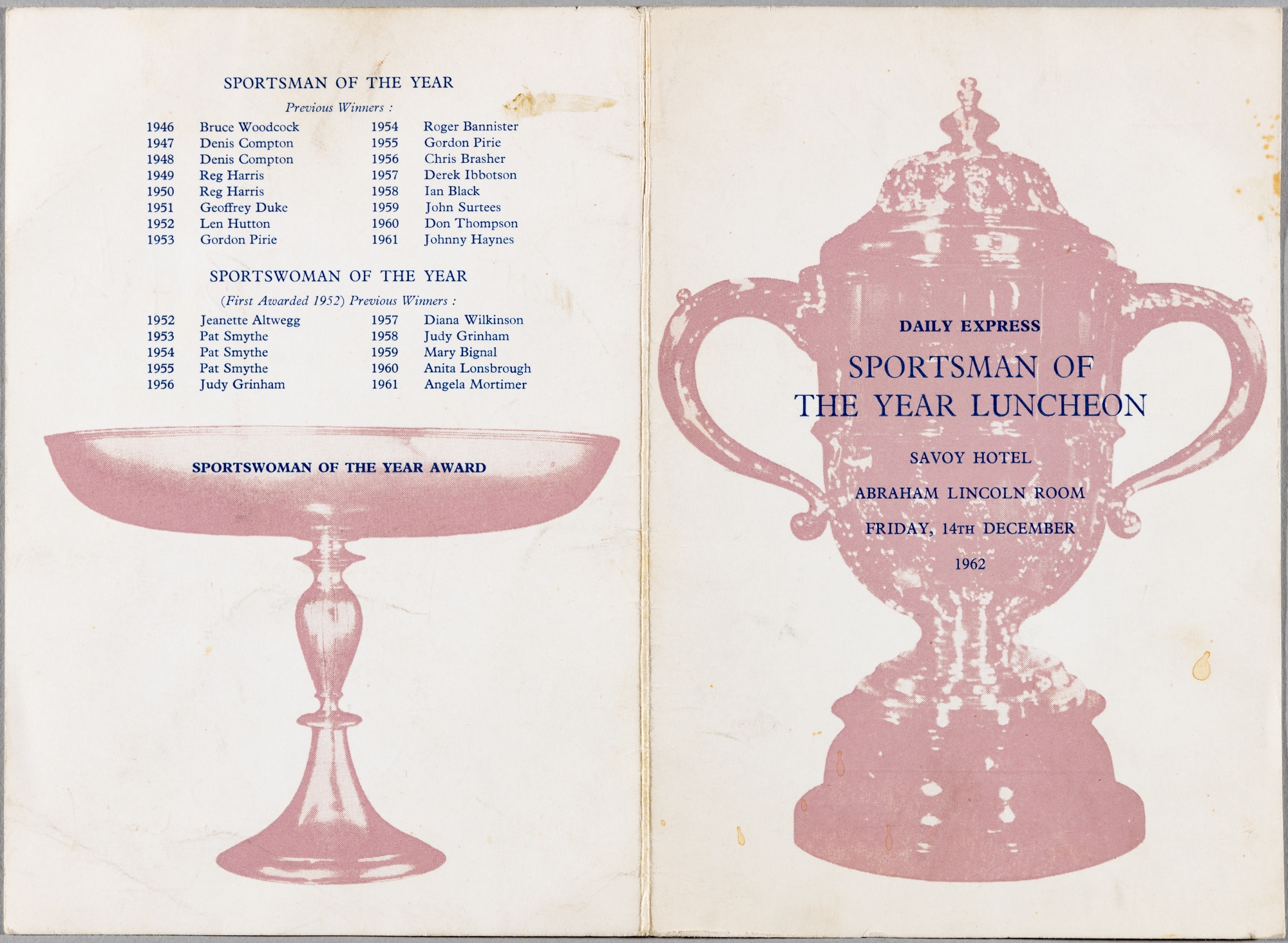 1962 SPORSTSMAN OF THE YEAR AUTOGRAPHED MENU INC: MARY RAND, BRIAN PHELPS, TERRY DOWNS, JOHNNY HAYNES, DON THOMPSON PLUS OTHERS Menu from the 1962 Daily Express Sportsman of the year awards luncheon at the Abraham Lincoln room. Savoy Hotel, 14th December, 1962. Autographed in ink to the inside back cover by 9 of the guests including many former sportsmen and sportswomen of the year including: MARY RAND, JOHNNY HAYNES, TERRY DOWNS, BRIAN PHELPS, DON TOMPSON, ANITA LONSBOROUGH et al. Good condition.