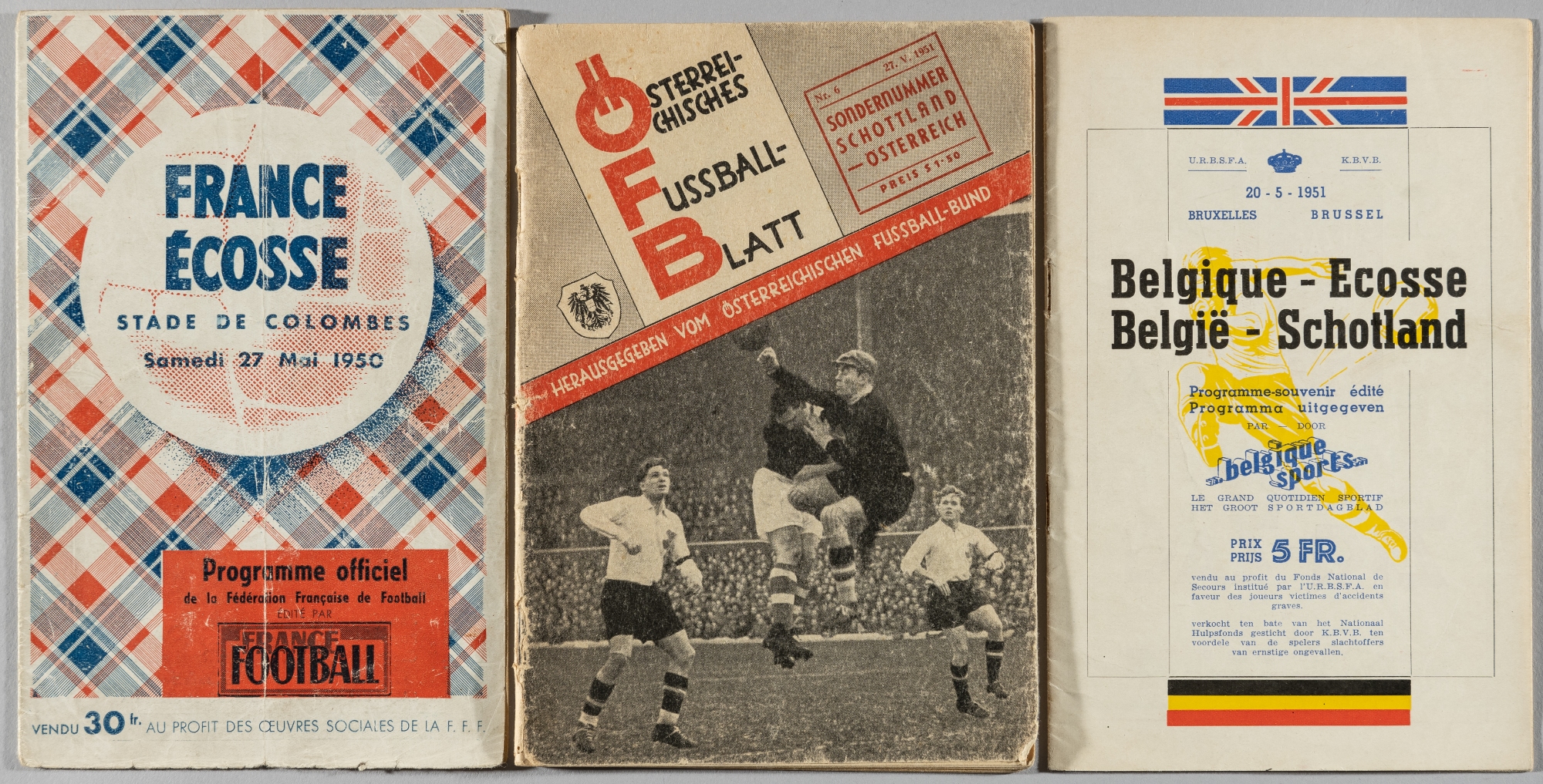 Scotland away international programmes, 1950-51, include at France 27th May 1950; at Austria 27th May 1951; at Belgium 20th May 1951, fair, each with