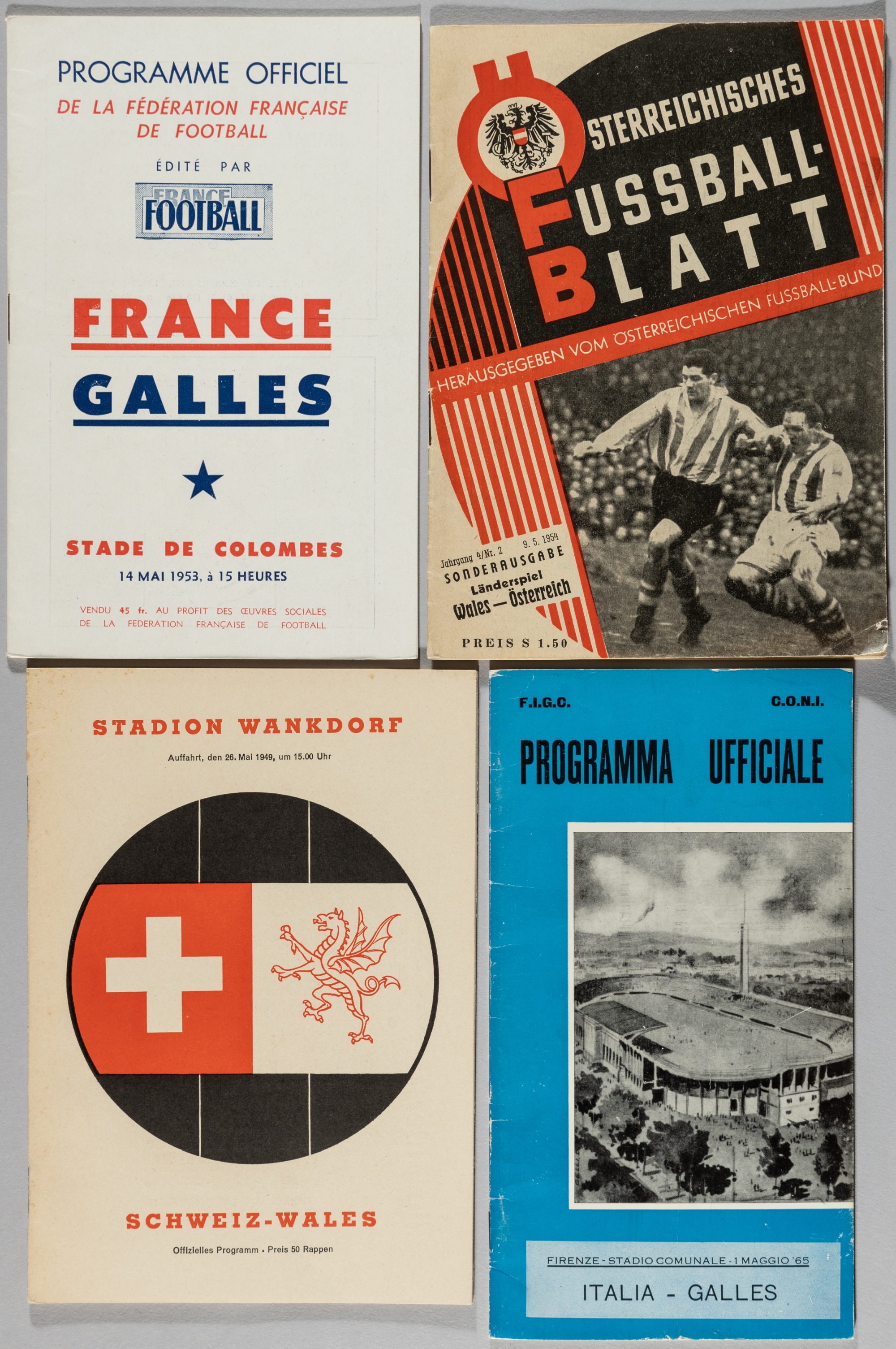 Wales away programmes, 1949-65, includes at Switzerland 26th May 1949; at France 14th May 1953; at Austria 9th May 1954 and at Italy 1st May 1965, good condition, (4)