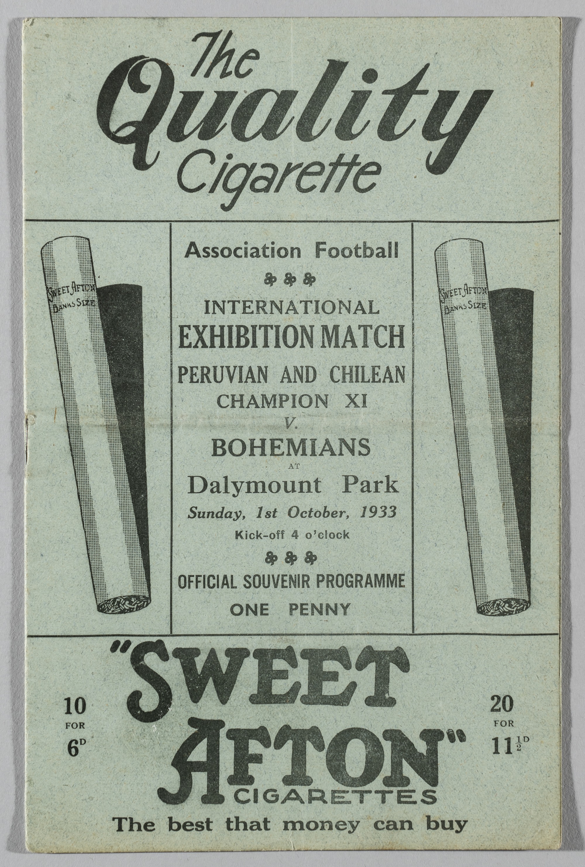 Republic of Ireland Bohemians exhibition programme v Peruvian & Chilean Champion XI, played at Dalymount Park, 1st October 1933, 12-page programme, good with vertical and horizontal fold, cellotape repair to back inside page near staple, slightly grubby This was the first match of their tour to Europe.