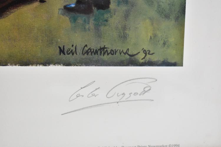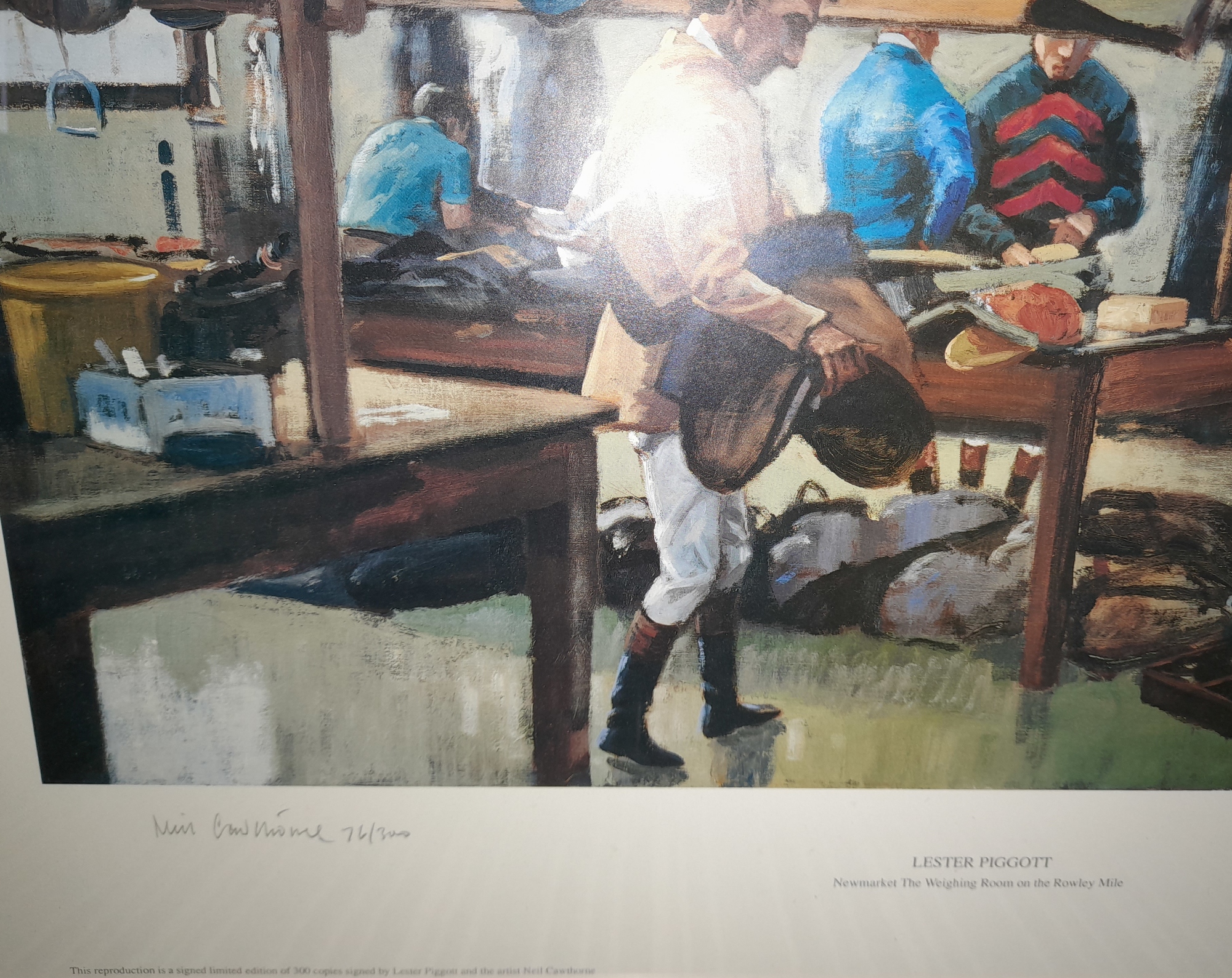 Horse Racing: Lester Piggott, signed & framed Limited Edition Print no.76 of 300 titled "Newmarket The Weighing Room on the Rowley Mile" by Original artist Neil Cawthorne, this is a reproduction print to a run of just 300, signed by Lester in pencil to lower right hand side of border, pencil will never fade, also signed by the artist to left hand side border with the ltd edition number. Stylishly framed to measure 28 by 21in. Please be aware all glass will be removed from framed and glazed items prior to posting and may result in delays to shipping your items. (This service is included in the cost of postage and packing). We can also totally remove all framing and mounts upon request to reduce shipping costs. Alternatively lots can be collected in person by prior appointment from NN8 1RT.