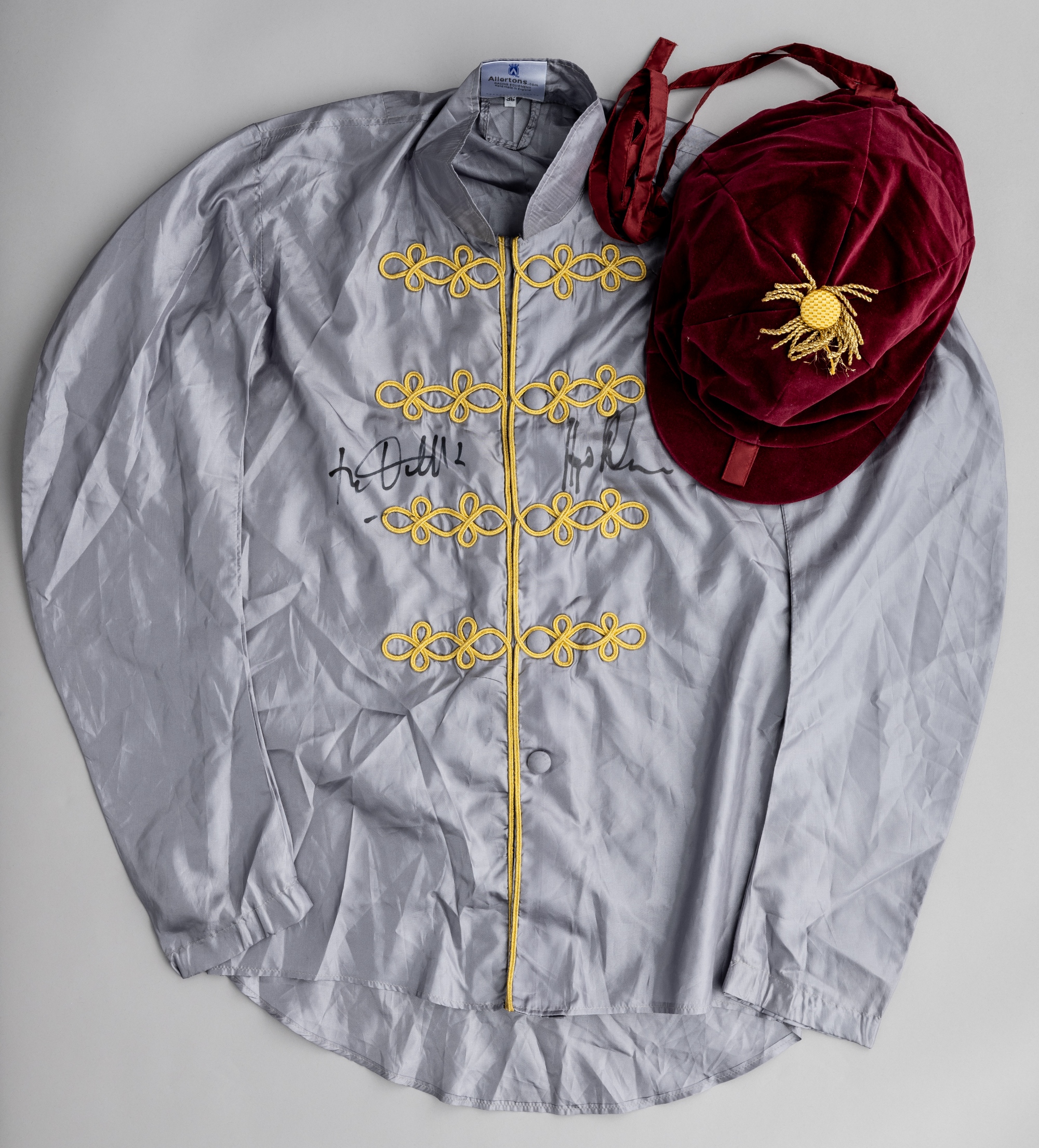 Al Shaqab Racing silks signed by Frankie Dettori and Hugo Palmer, with Alltertons neck label, size 36, grey jacket with gold braid, maroon velvet cap with gold tasse, signed in black marker by jockey Frankie Dettori and trainer Hugo Palmer Owners of Olympic Glory, Toronado, The Wow Signal, Treve, Shalaa, Galileo Gold, Qemah, Zelzal, Mekhtaal, Al Wukair, Wooded, Ebro River (trained by Hugo Palmer) et al.