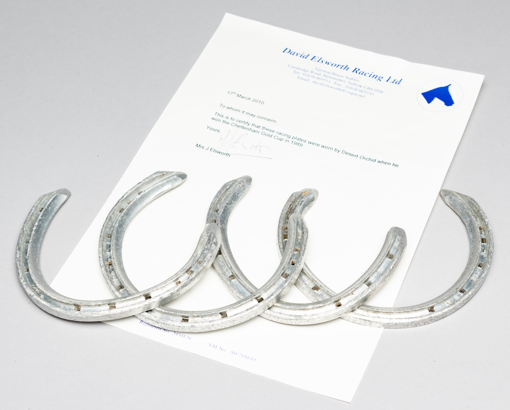 Desert Orchid racing plates worn when he won the Cheltenham Gold Cup, on 16th March 1989, aluminium racing plates, with letter of authentication from David Elsworth racing dated 17th March 2010, the pre-race favourite was ridden by Simon Sherwood and trained by David Elsworth, owned by Richard Burridge, each plate bearing slight wear, (4)