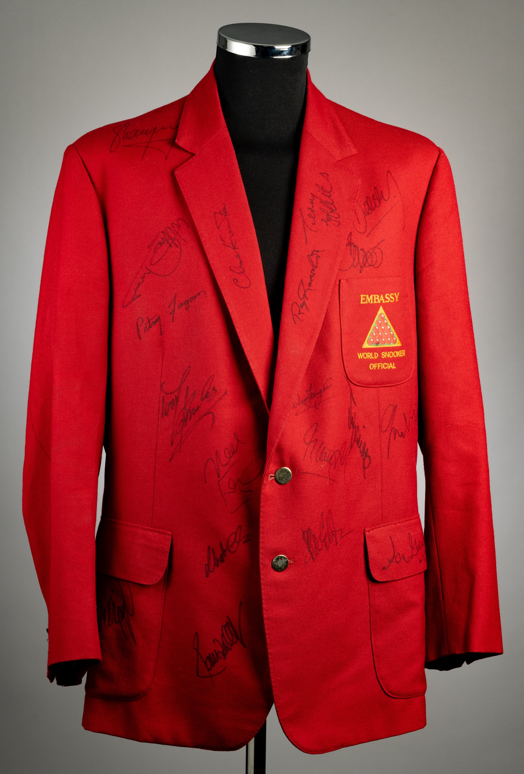 Referee Len Ganley's Embassy World Snooker Official's jacket multi-signed by personalities from the sport, red cloth jacket with EMBASSY WORLD SNOOKED OFFICIAL embroidered with red snooker balls on chest pocket, by Hunt & Winterbotham, no size label, signed in black marker by Ganley and 18 snooker personalities, comprising Patsy Fagan, Shaun Murphy, Ray Reardon, Terry Griffiths, Dennis Taylor, Jimmy White, Willie Thorne, Steve Davis, Stephen Hendry, Peter Ebdon, John Virgo, Ken Doherty, John Parrott, Clive Everton, Neal Foulds, Tony Knowles, Mark Williams and Ronnie O'Sullivan, bears minor wear Len Ganley MBE (1943-2011) was born in Lurgan, County Armargh, and in his youth won several local snooker titles before becoming a full-time referee. In a glittering career he refereed four World Championship Finals at The Crucible in Sheffield between 1983 and 1993.
