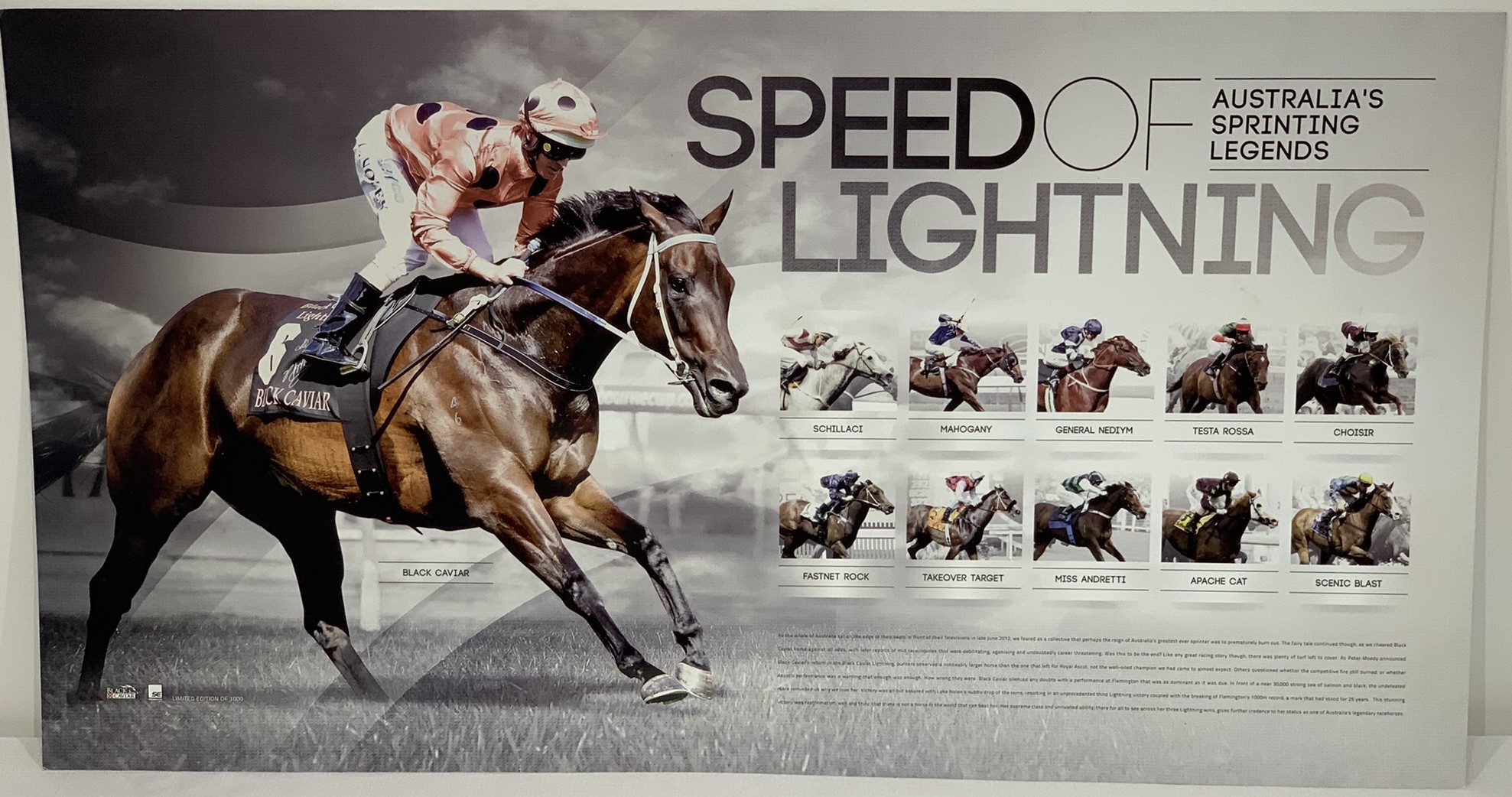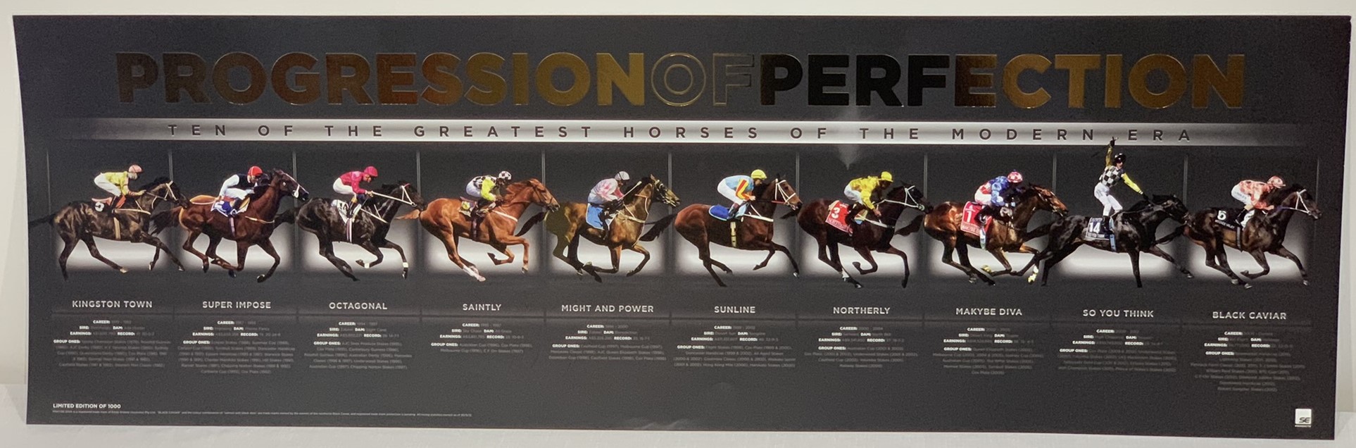 Collection of limited edition / official horseracing prints, including “Progression of Perfection – Ten of the Greatest Horses of the modern era” including Kingston Town, Super Impose, Saintly, Might & Power, Sunline, Northerly, Makybe Diva, So you can think and Black Caviar (produced by SE Products – Australia). Print size: 100 by 32cm. “A year to remember – Black Caviar” Print Size 83 by 40cm; “Speed of Lightning – Australian Sprinting Legends”. Print Size 92 by 49cm (3 items)