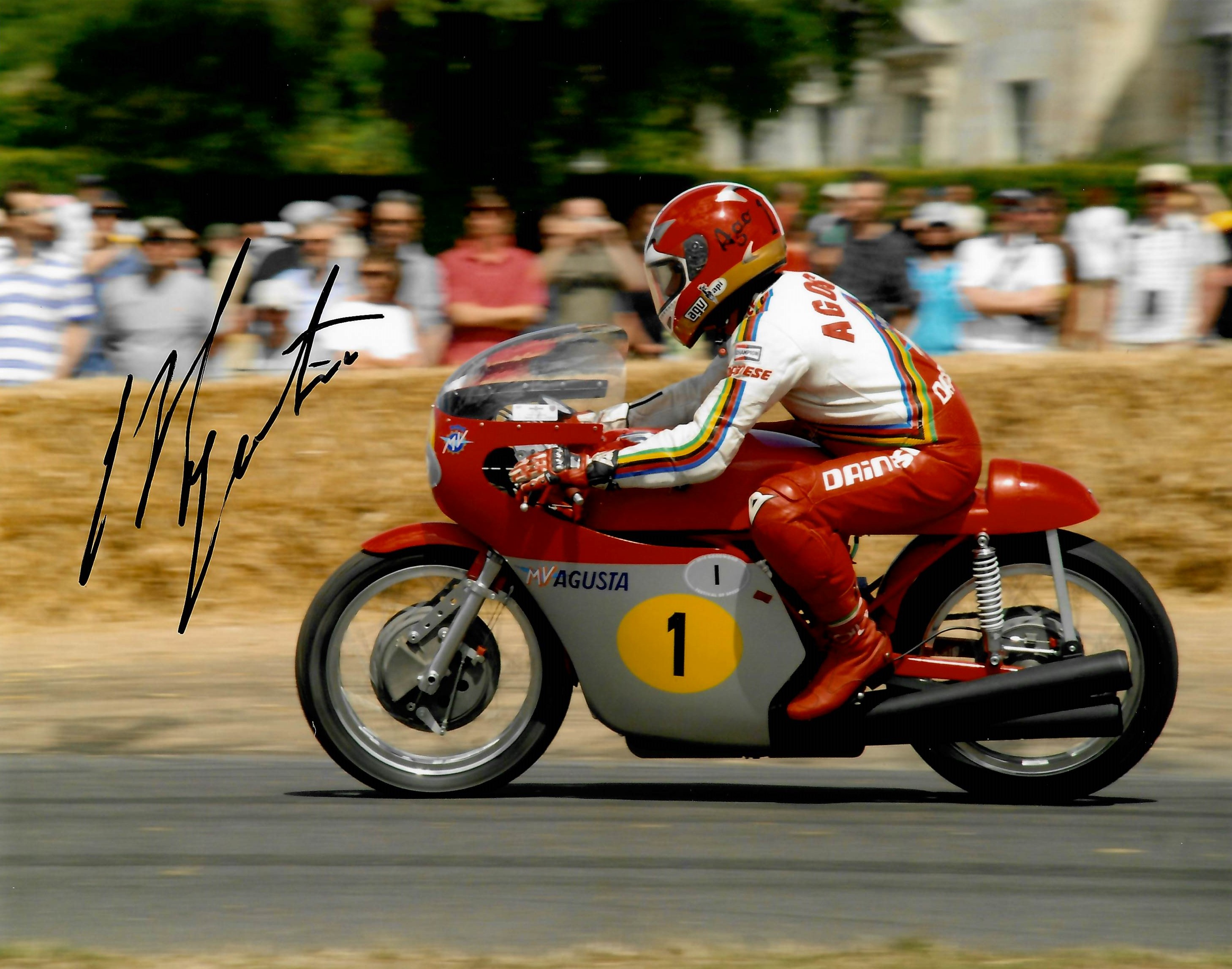 Giacomo Agostini (Italy) signed Italian Moto GP ½ Scale Mini helmet, signed on helmet with black sharpie, Over a period of 17 years, Giacomo Agostini achieved an impressive 15 World Championship titles and 122 Grand Prix wins. Of these wins, 8 World Championships were amassed in the 500cc class (the forerunner to MotoGP). Giacomo (nicknamed Ago) dominated motorcycle racing for two decades, with two different manufacturers. Although he retired from racing in 1977, Giacomo remains to this day the most successful motorcycle champion in Grand Prix history. Also includes signed action 8”x10” photo and COA with exact photo proof. (3 items in total)