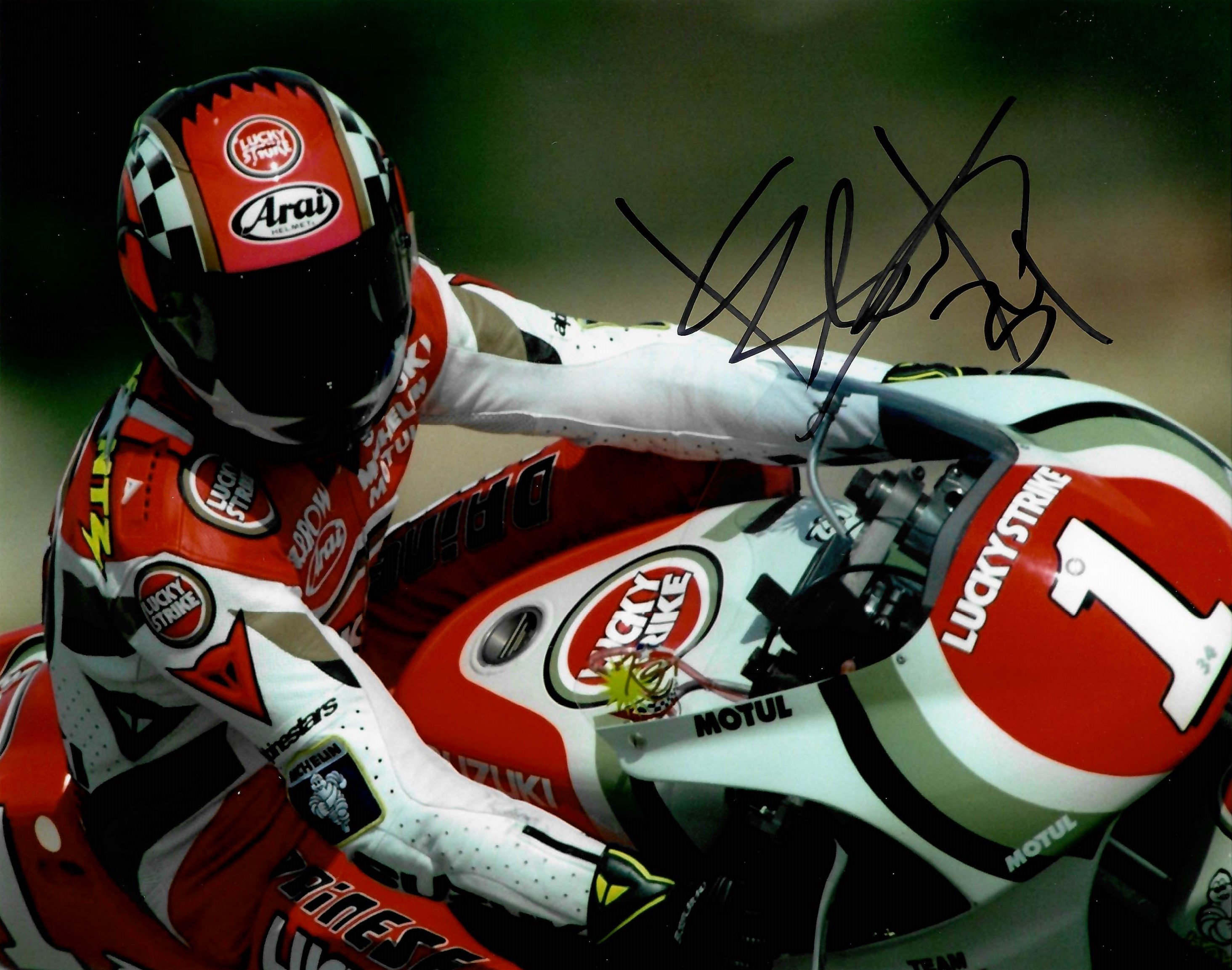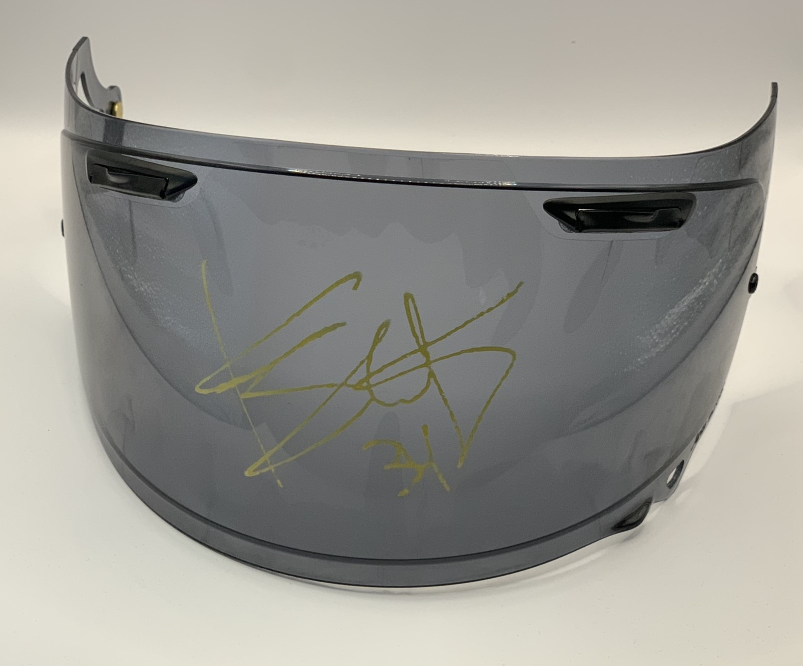 Kevin Schwantz (USA) 1993 World Moto GP Champion signed collection, including signed Aria Black tinted visor (signed in gold), same brand as he wore and fits Schwantz Aria Helmet. Also included is signed 8 by 10in. action photograph of Kevin Schwartz. Both items come with exact photo proof and COA. (Total of 4 items)