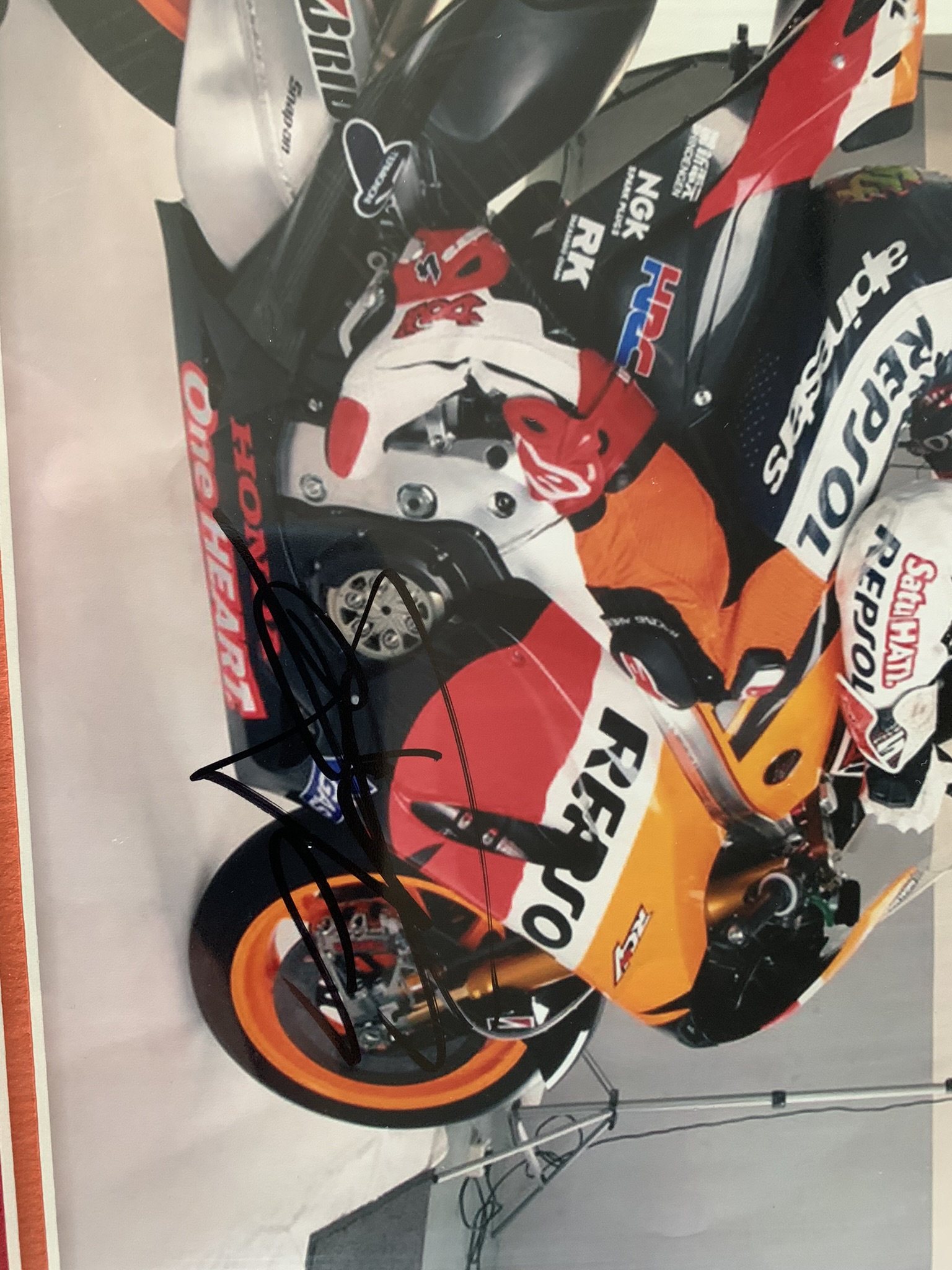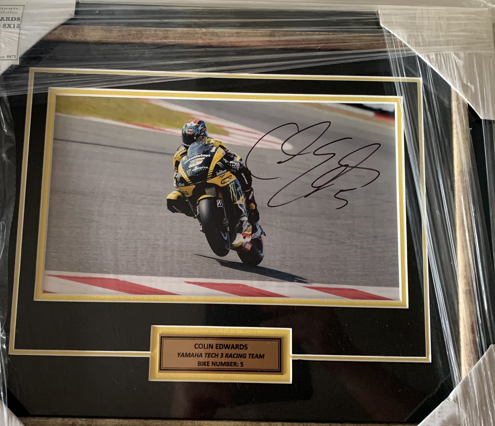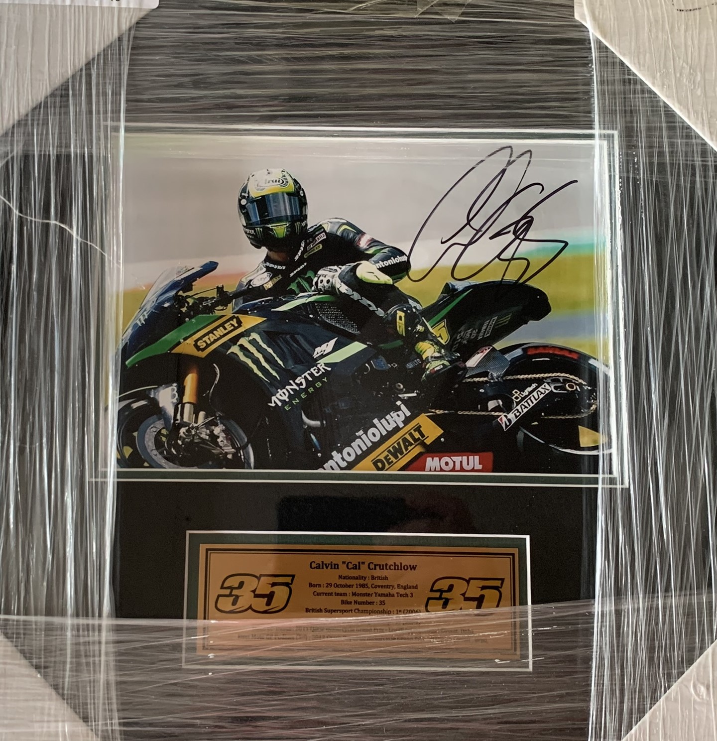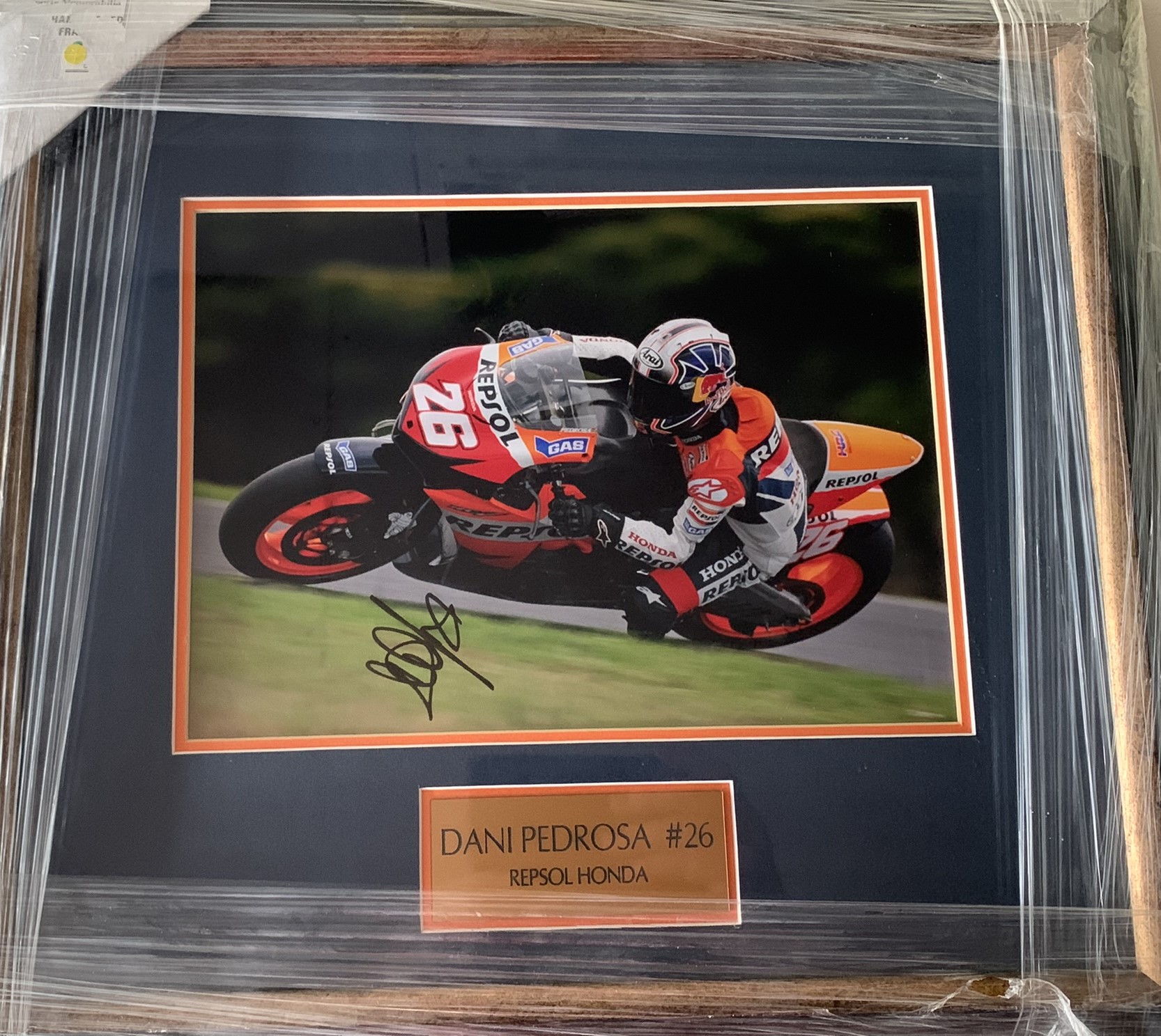 Moto GP Collection of five framed signed photographs, all professionally framed / glazed with double mattes and plaque on rider stats. Includes Cal Crutchlow (UK), Dani Pedrosa (Spain), Colin Edwards (USA), Ant West (Australia) and Andrea Dovizioso (Italy). Each item has it’s own COA and photo proof of signing attached the back of the frame. (Total of 5 items).