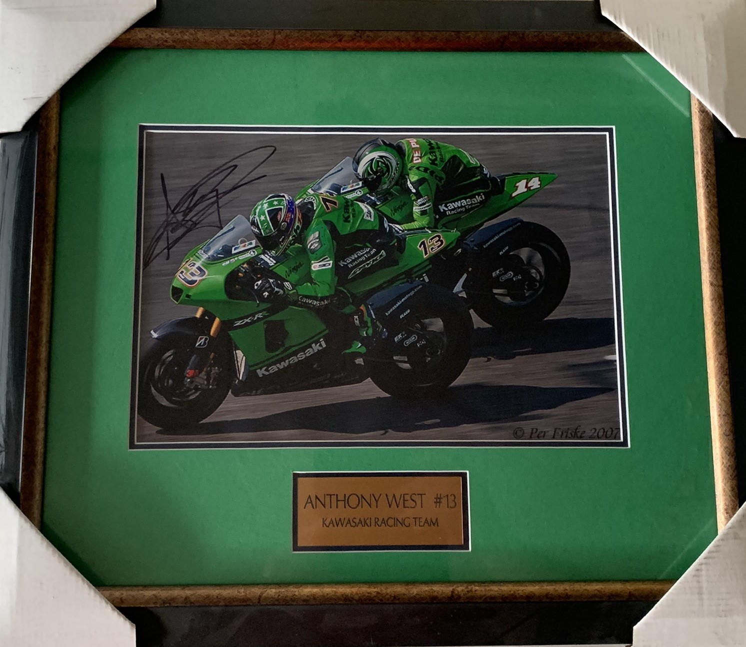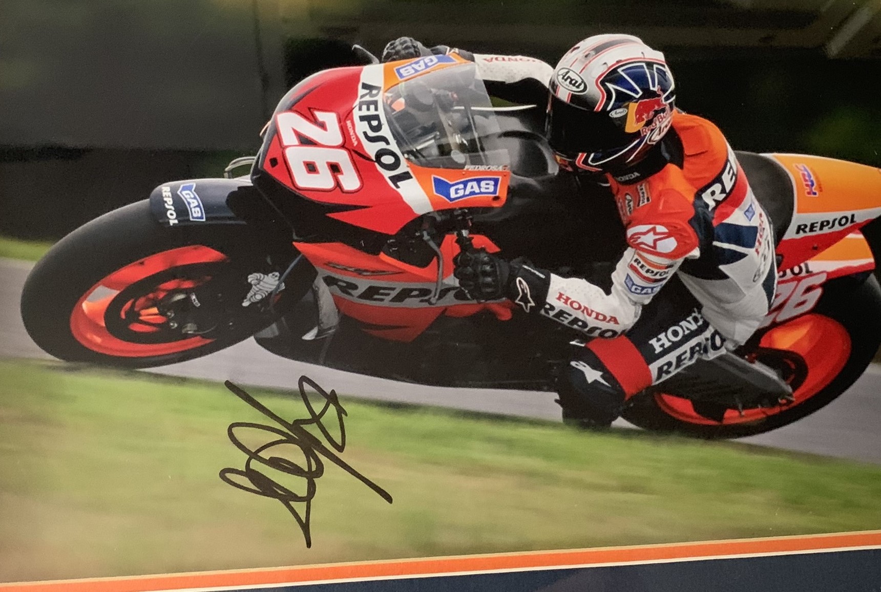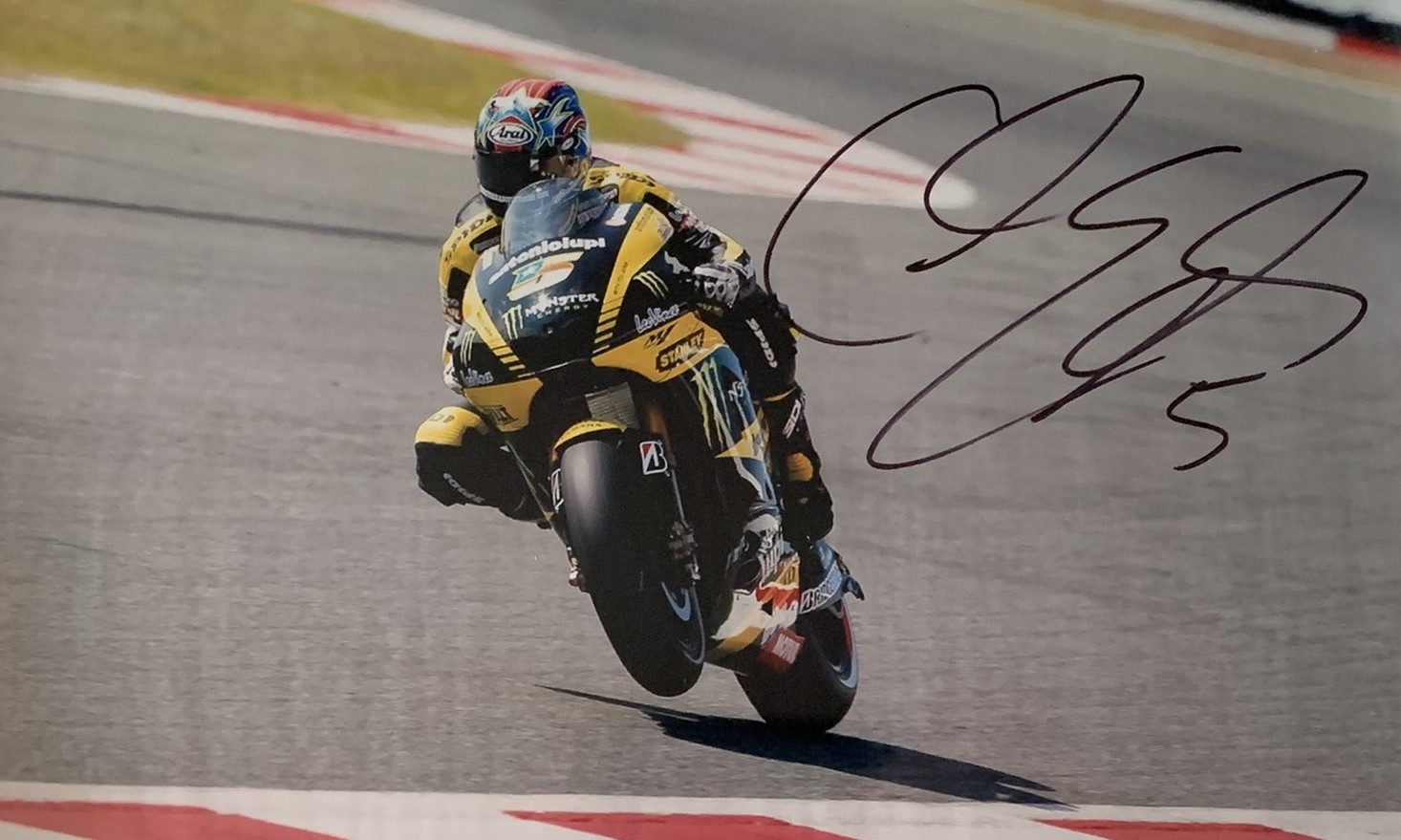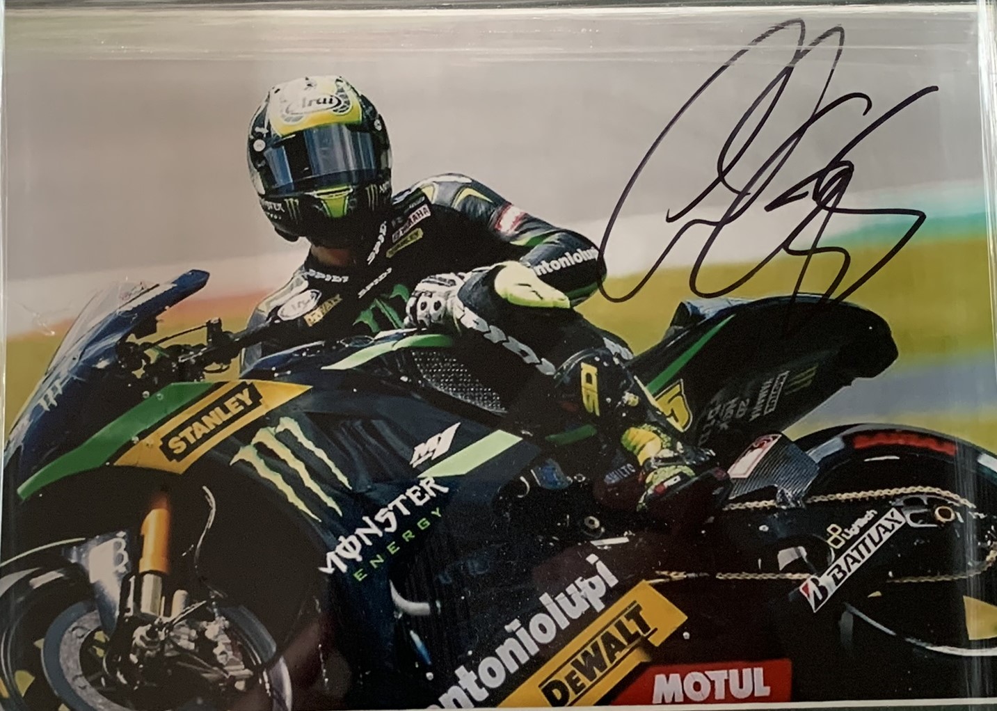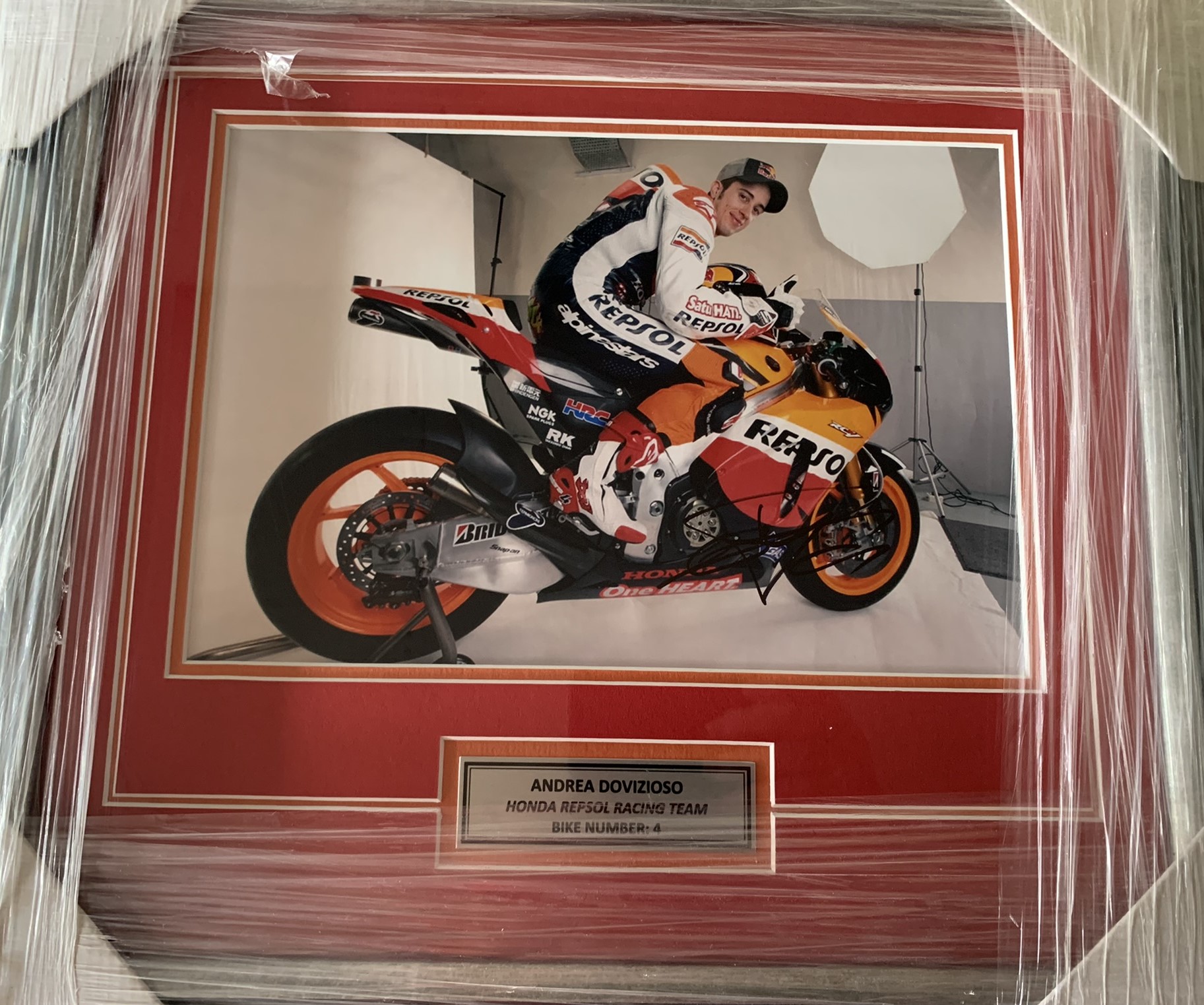 Moto GP Collection of five framed signed photographs, all professionally framed / glazed with double mattes and plaque on rider stats. Includes Cal Crutchlow (UK), Dani Pedrosa (Spain), Colin Edwards (USA), Ant West (Australia) and Andrea Dovizioso (Italy). Each item has it’s own COA and photo proof of signing attached the back of the frame. (Total of 5 items).
