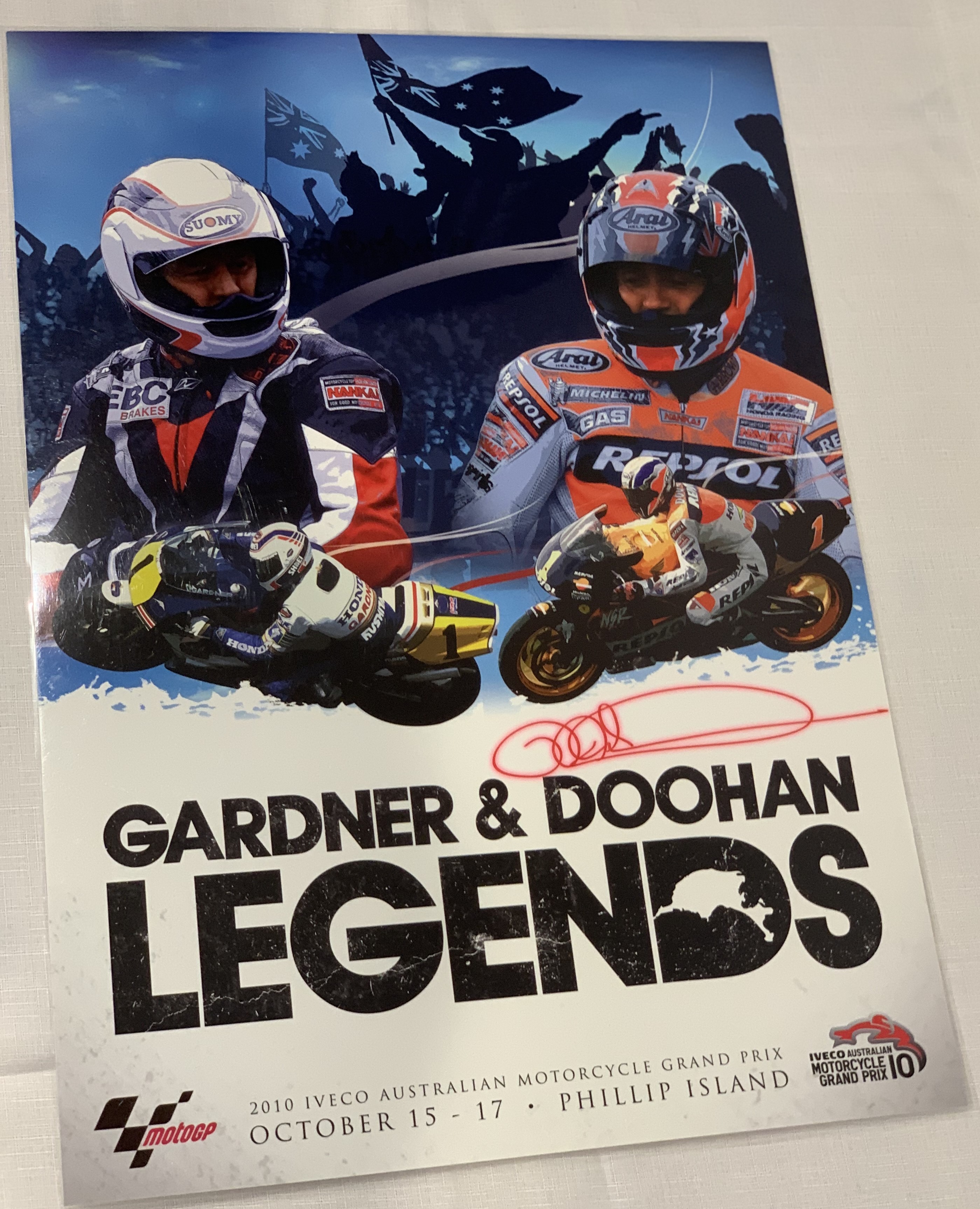 Two Australian Moto GP Promotional Posters, comprising Mick Doohan (Australia) signed Australian Moto GP 2010 laminated poster “Gardner & Doohan Lege