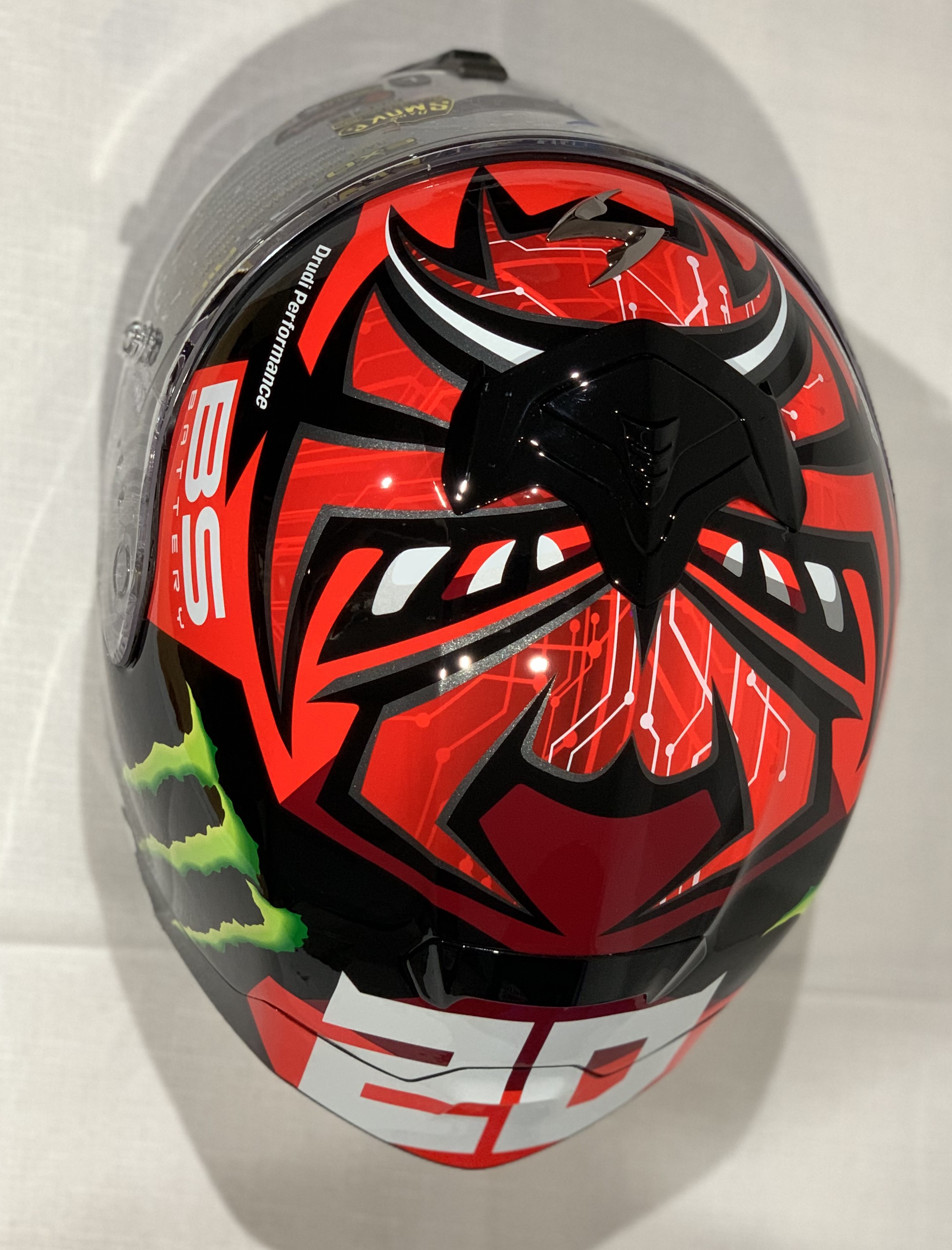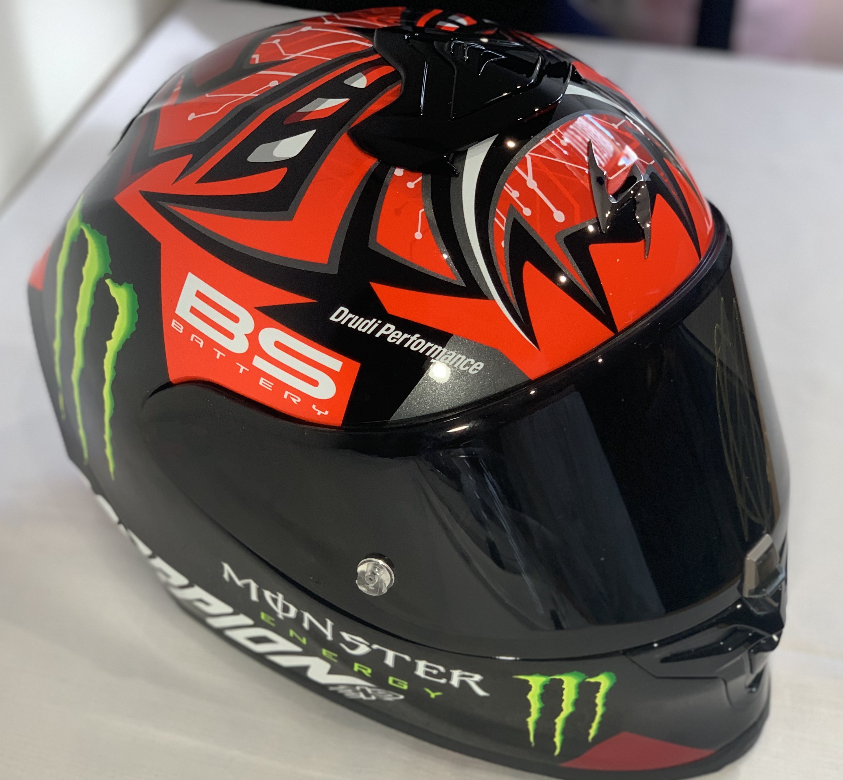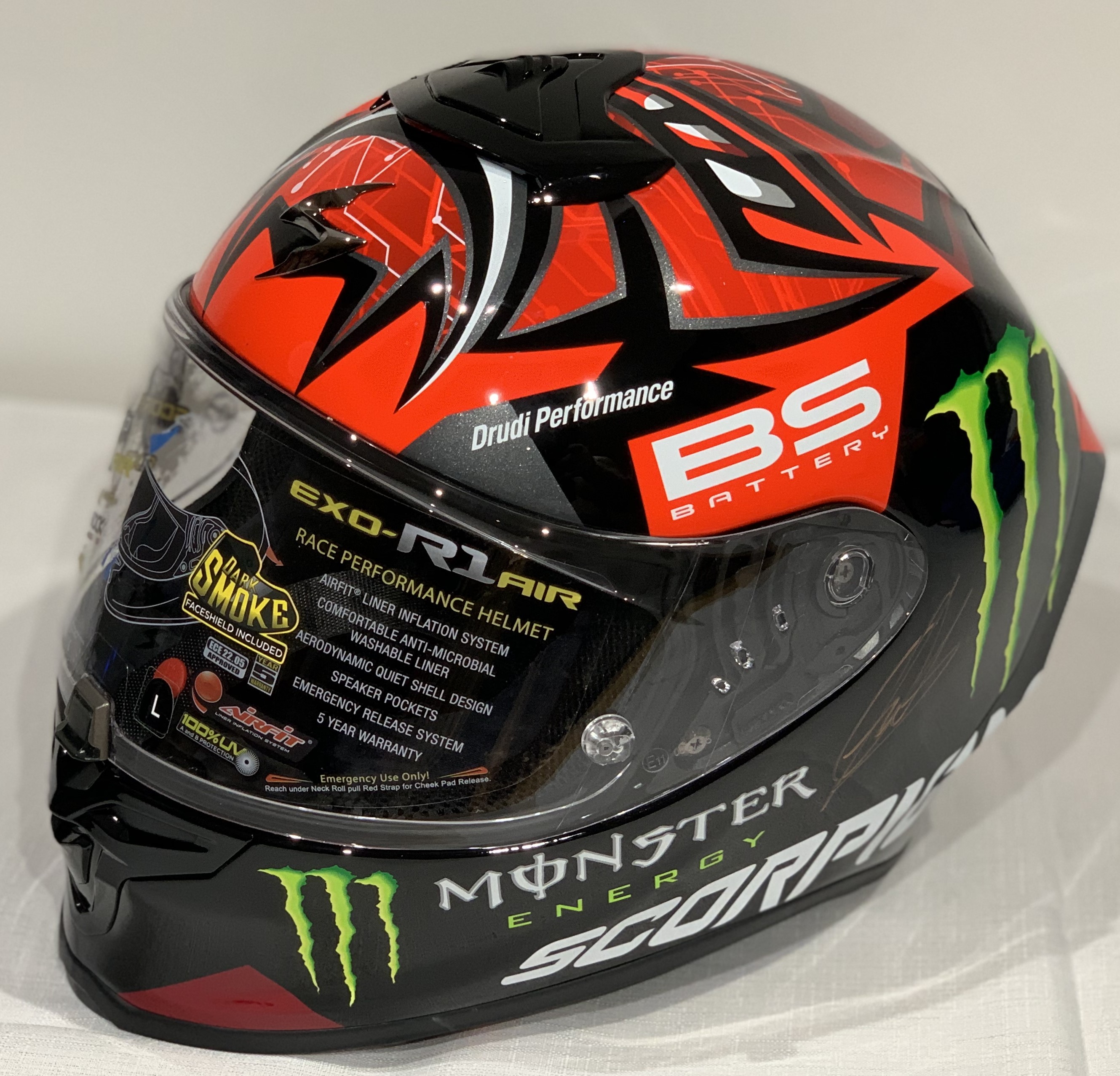 Fabio Quartararo (France) signed Scorpion EXO-R1 AIR, Fabio Quartararo Monster Red Moto GP Helmet, Signed in gold permanent marker on side of helmet