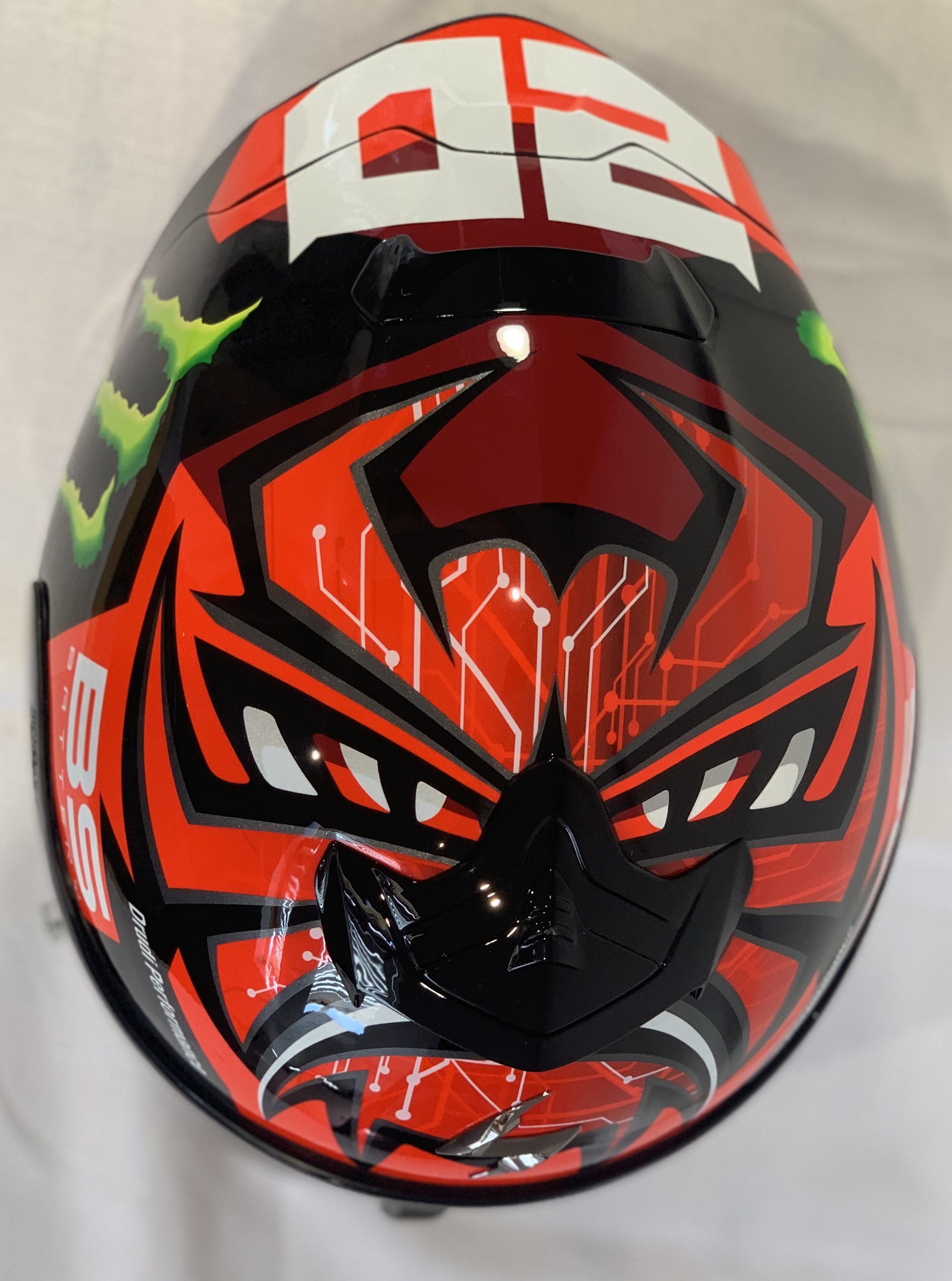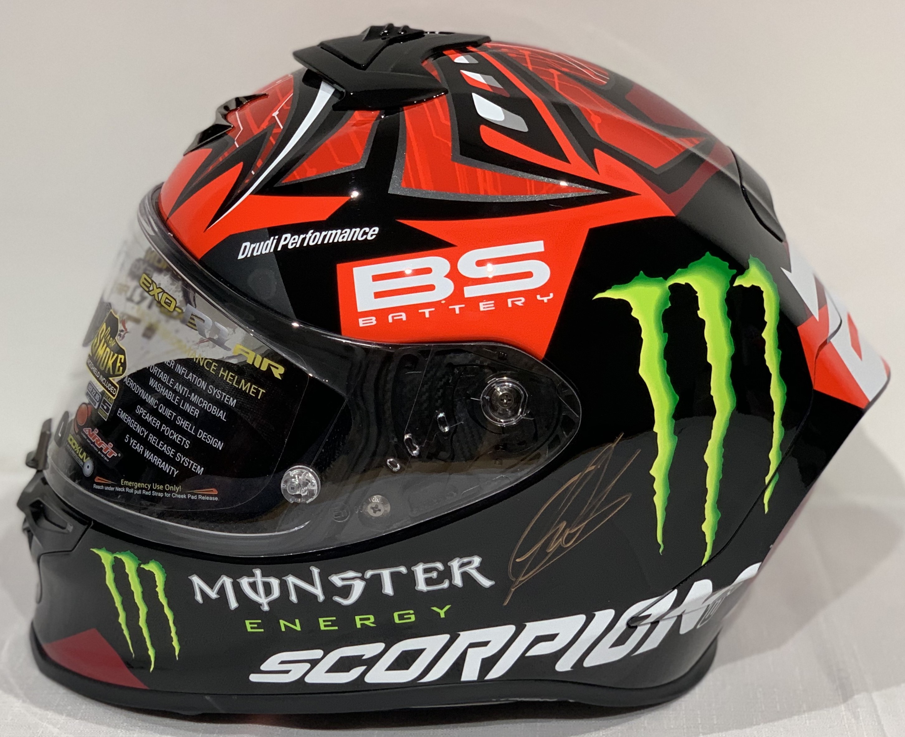 Fabio Quartararo (France) signed Scorpion EXO-R1 AIR, Fabio Quartararo Monster Red Moto GP Helmet, Signed in gold permanent marker on side of helmet. Fabio Quartararo won the 2021 Moto GP World Championship, wearing this exact model of helmet. A magnificent helmet. Comes with photo proof and COA. (2 items)