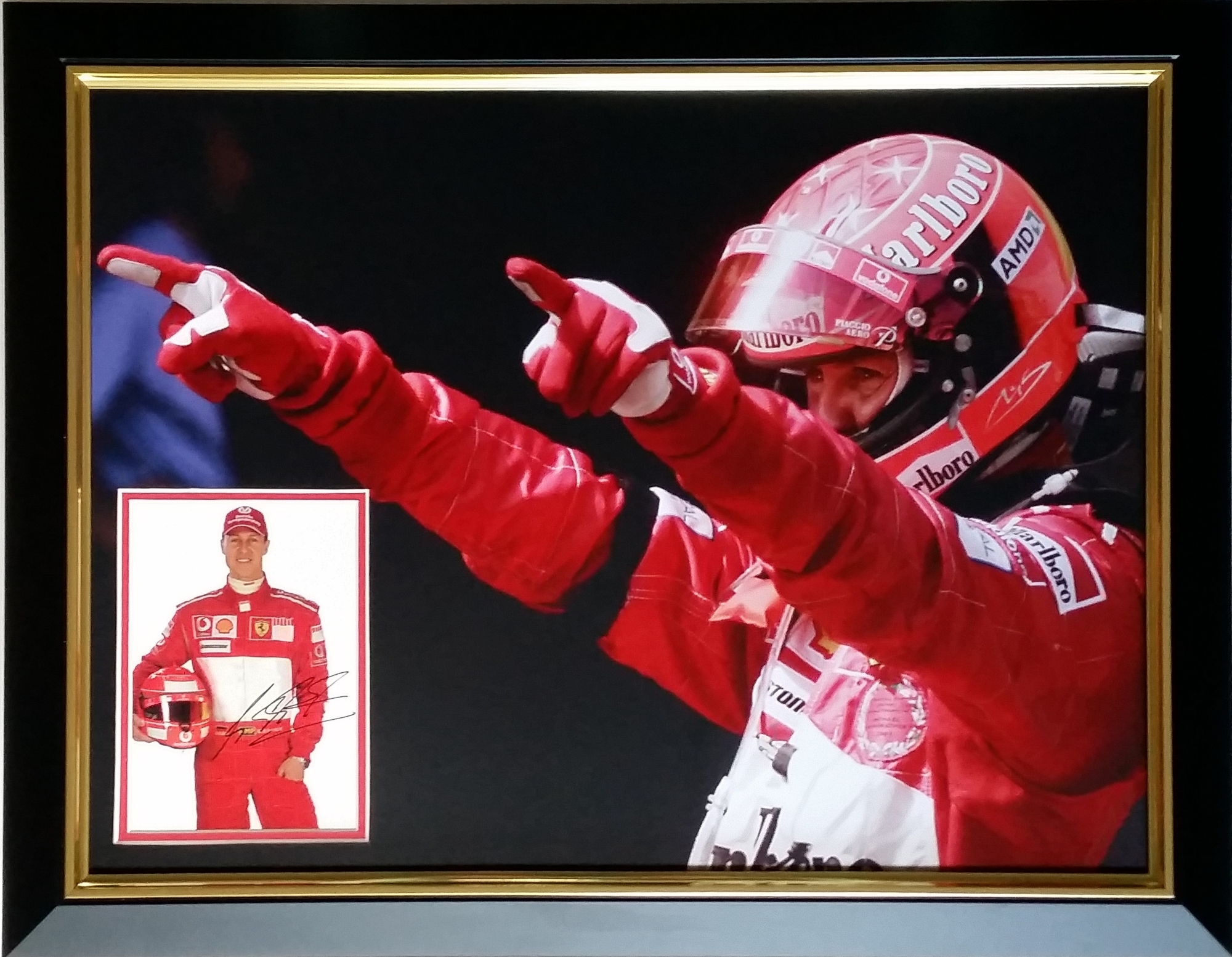Michael Schumacher seven time F1 World Champion signed and framed display, measuring 69 by 55cm., features an official Ferrari sponsors postcard autographed by Michael that has ben mounted within a large headshot image of this racing great, comes with COA