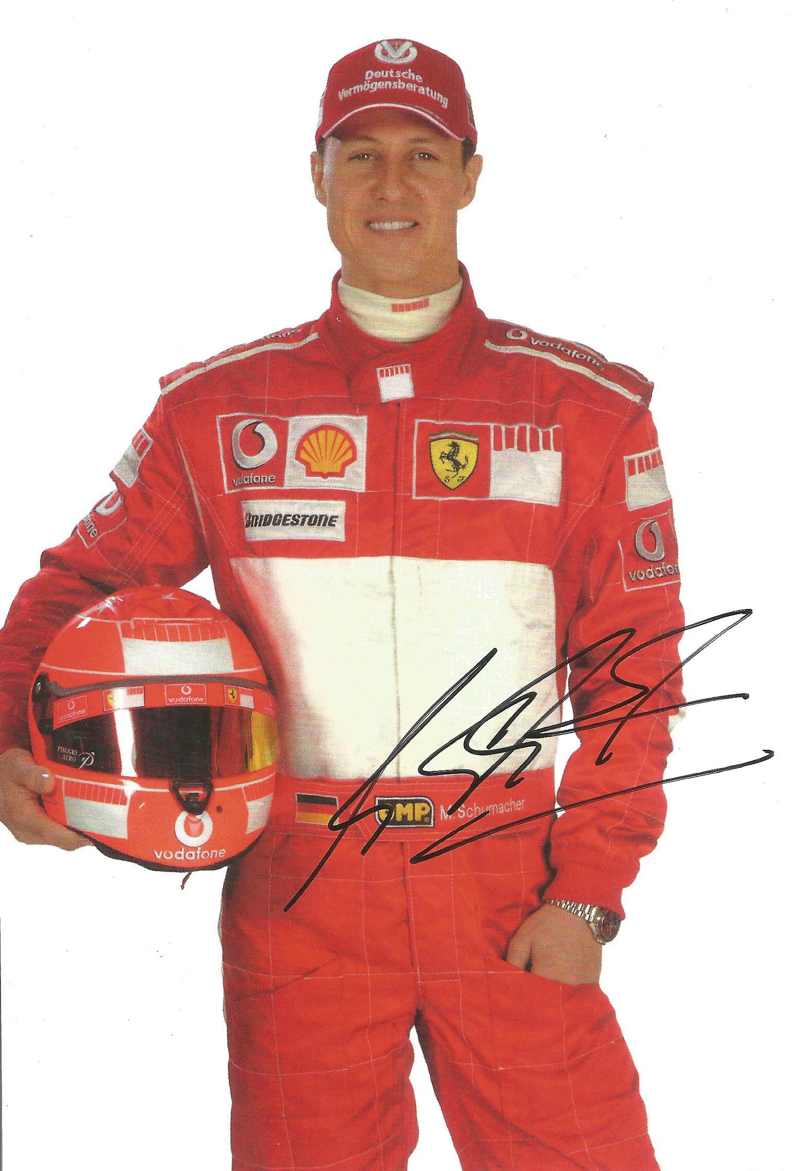 Michael Schumacher seven time F1 World Champion signed and framed display, measuring 69 by 55cm., features an official Ferrari sponsors postcard auto