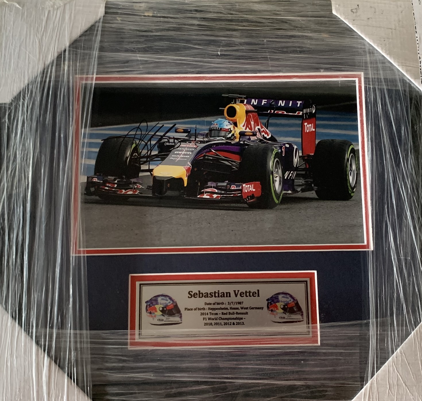 Sebastian Vettel signed/framed action Red Bull Racing photograph, Vettel has just announced his retirement and was a triple World Champion with Red Bull. Professionally framed / glazed with double mattes and plaque on Vettel’s achievements. Frame Size: 40 by 38cm. Comes with COA and exact photo proof.