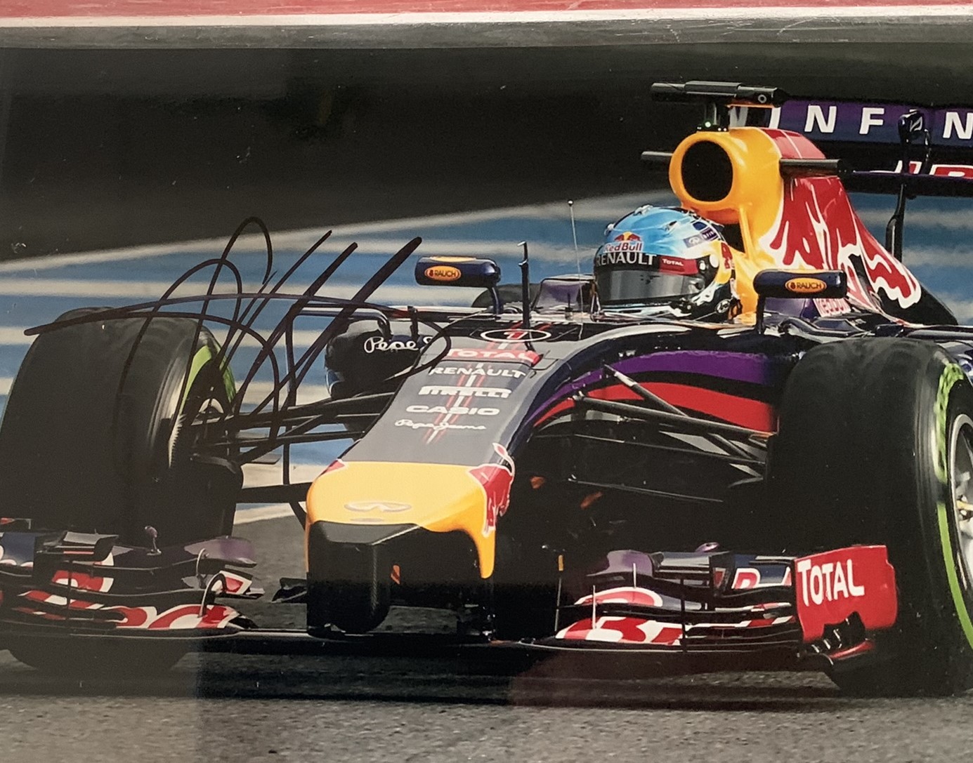Sebastian Vettel signed/framed action Red Bull Racing photograph, Vettel has just announced his retirement and was a triple World Champion with Red